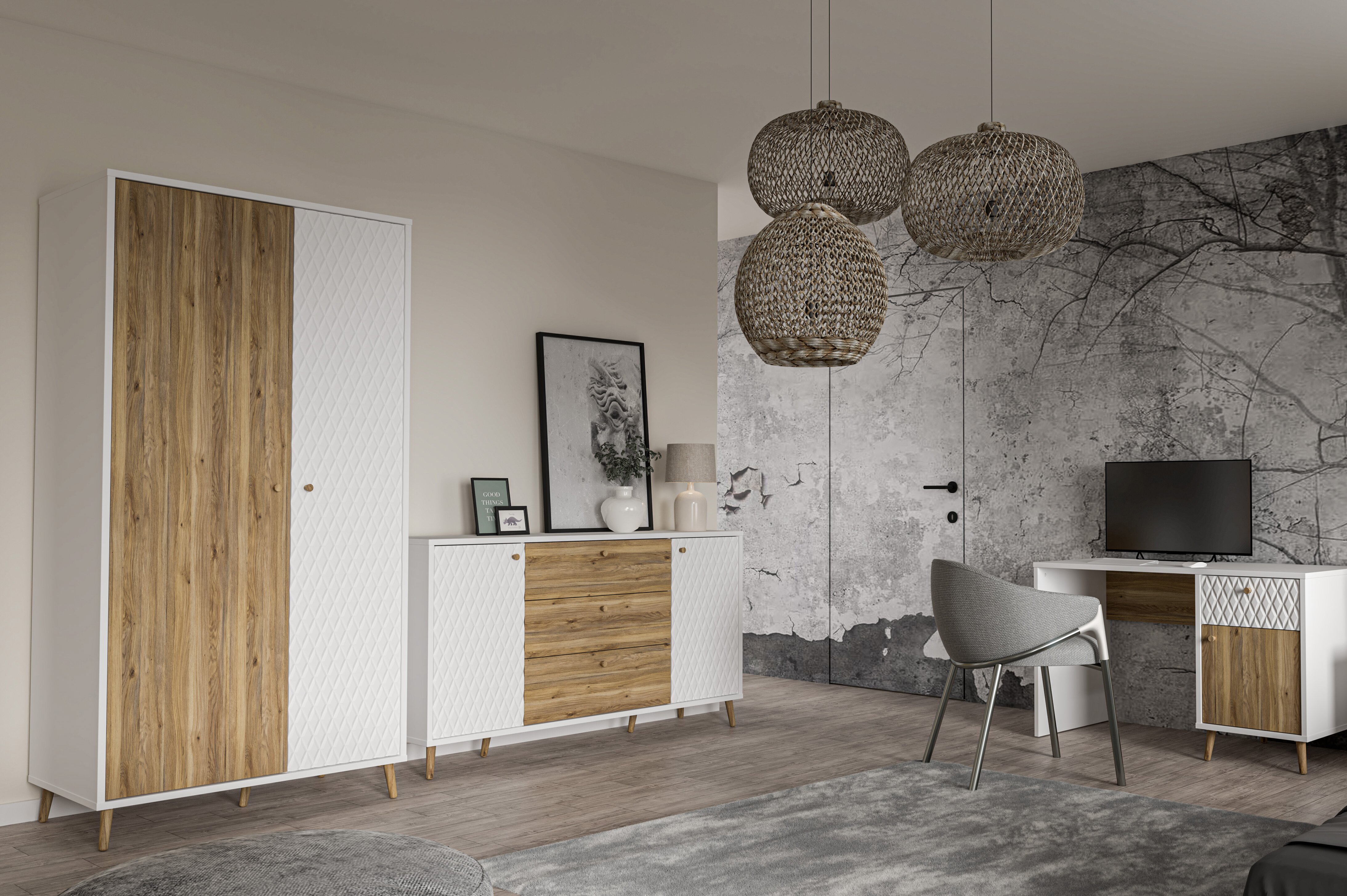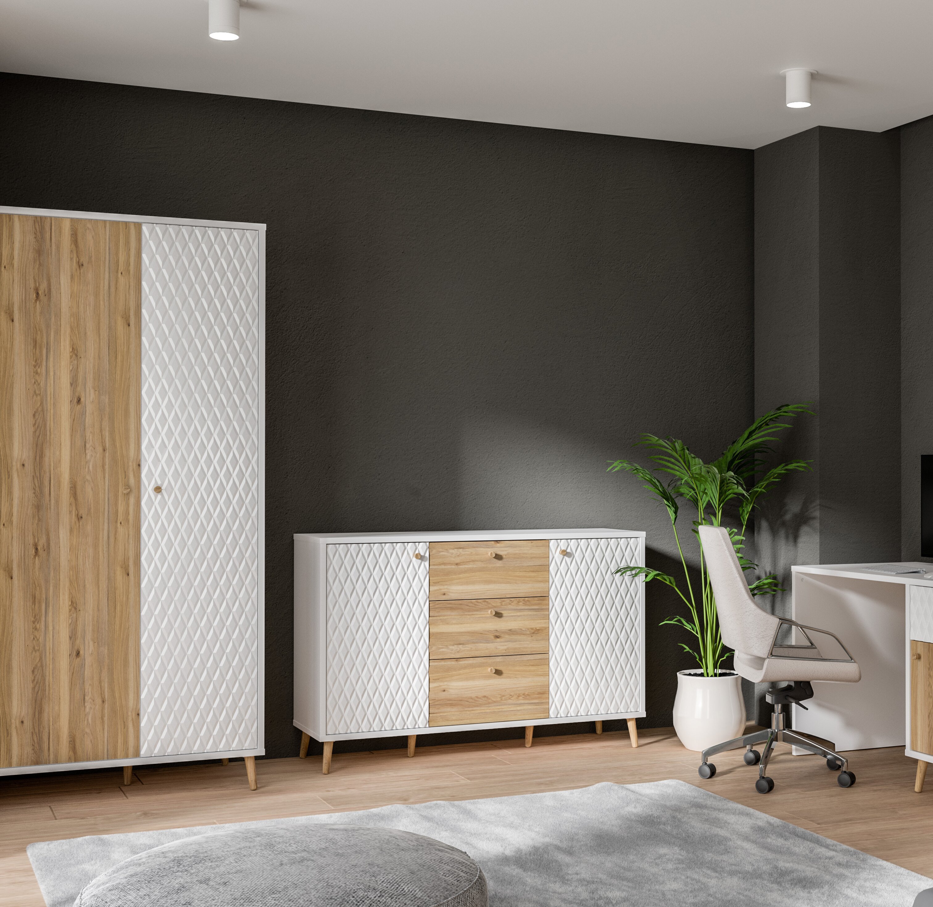 Kolekcja AKSANA to eleganckie połączenie nowoczesnego stylu z subtelnymi, ryflowanymi wstawkami na frontach, które dodają wnętrzu charakteru i głębi. Wysokie nóżki nadają meblom lekkości, a jednocześnie ułatwiają utrzymanie porządku. Choć dedykowana przede wszystkim do salonu, w kolekcji znajdziemy również stylowe biurko, które idealnie komponuje się z resztą elementów. Jasne wykończenia oraz prosta forma mebli sprawiają, że AKSANA doskonale odnajdzie się w nowoczesnych wnętrzach. To propozycja dla osób, które cenią stylowy wygląd połączony z praktycznymi rozwiązaniami.