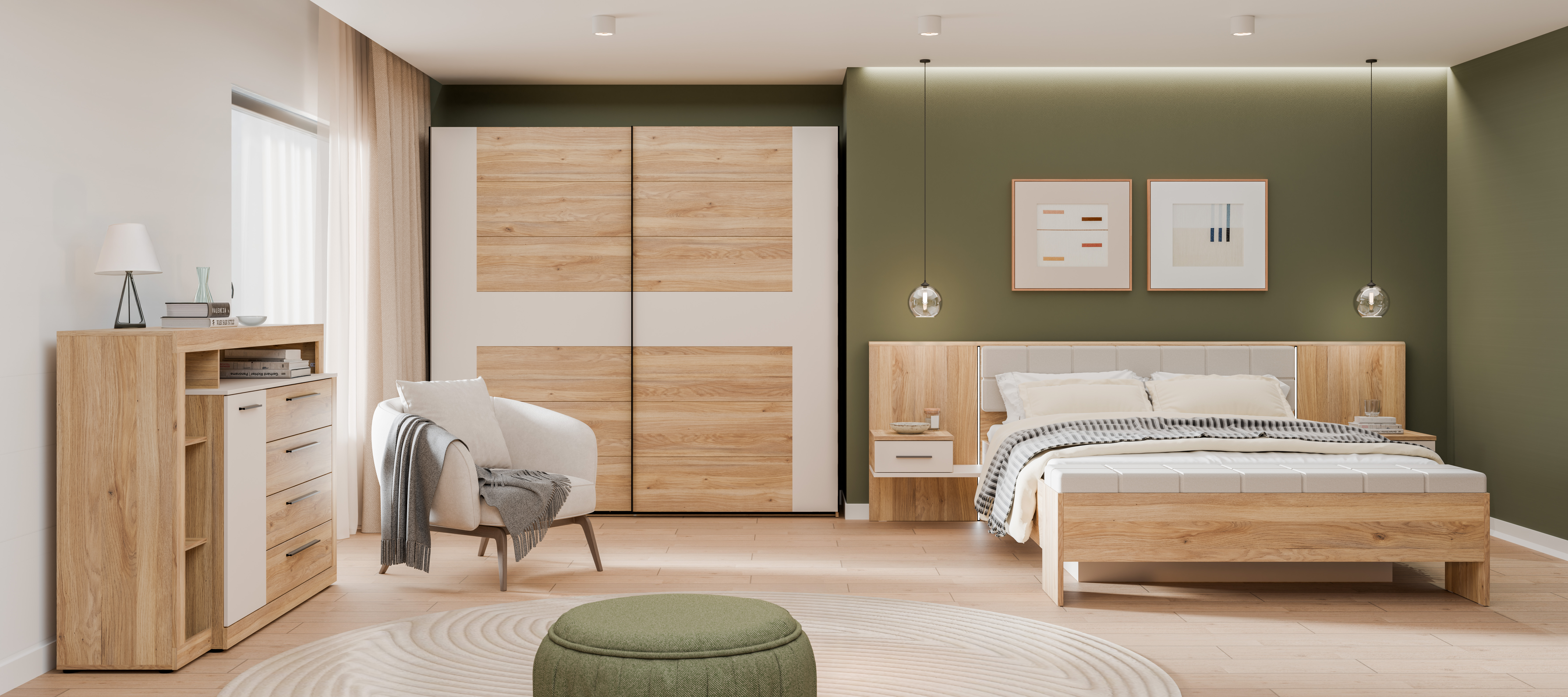 Nastrojowe oświetlenie u wezgłowia łóżka, tapicerowane siedzisko, subtelna gra kontrastów – kolekcja sypialnianych mebli BELLEVUE prezentuje się niezwykle elegancko. Narzuca nam aranżacyjne decyzje, tworząc wnętrze o danym klimacie i stając się wyróżnikiem naszego domu. Uwagę przykuwa także niecodzienny projekt poszczególnych mebli - komody połączonej z półką na książki oraz niebanalnych stolików nocnych.