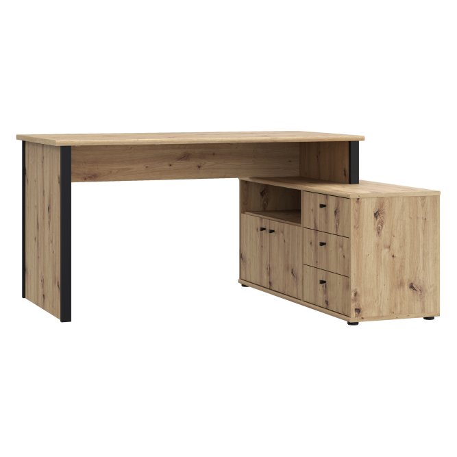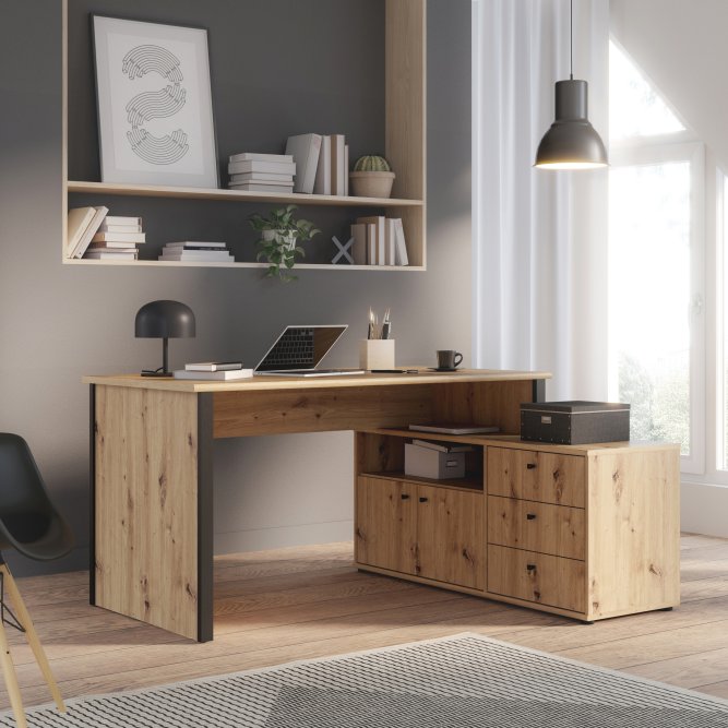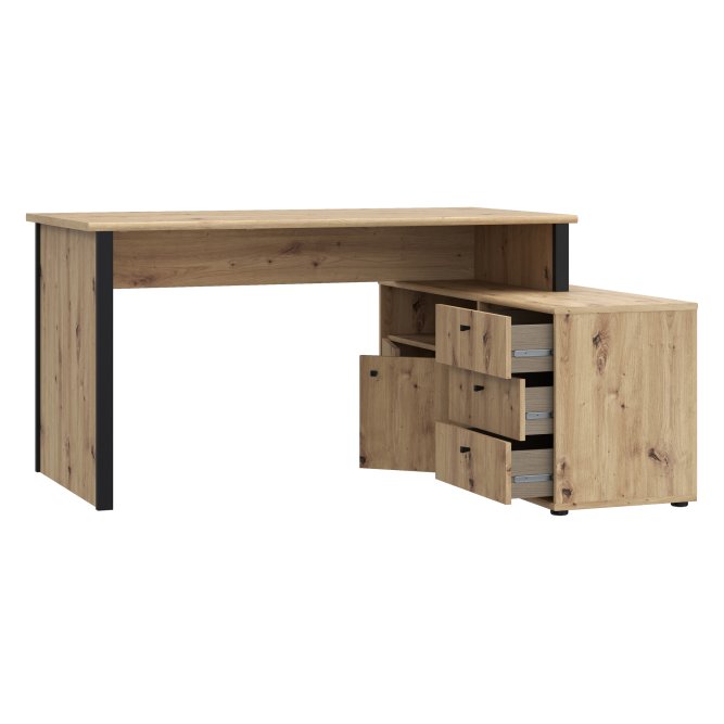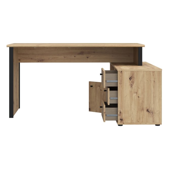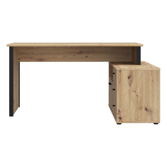 Biurko z komodą w ciepłym dekorze imitującym naturalne usłojenie drewna połączone z czarnym kolorem to idealny wybór, jeżeli chcesz umeblować pokój młodzieżowy lub domowe biuro. Wyposażone w wygodny blat, tworzy miejsce do pracy i nauki. Zintegrowana z biurkiem komoda, zawierająca trzy szuflady i zamykaną szafkę, dzięi czemu umożliwia przechowywanie najważniejszych rzeczy w pobliżu miejsca pracy.