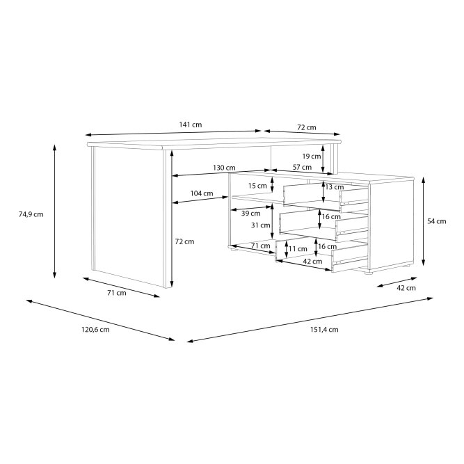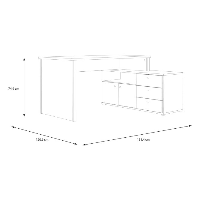 - Zestaw o wymiarach: szerokość 151,4 cm x wysokość 74,9 cm x głębokość 120,6 cm