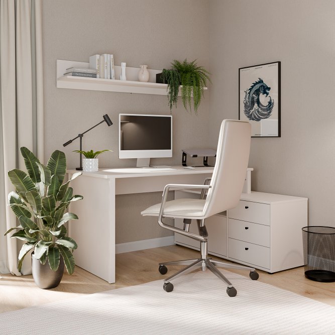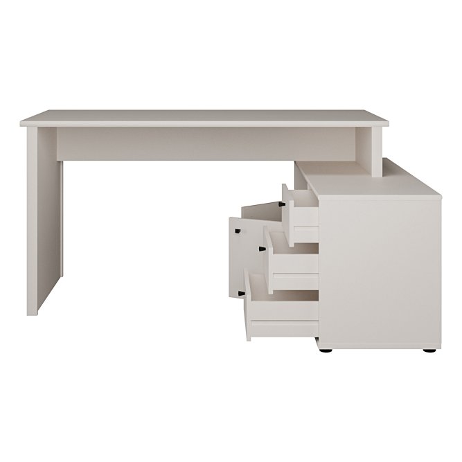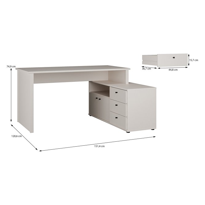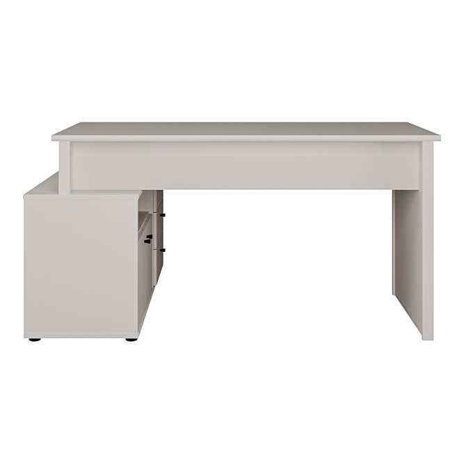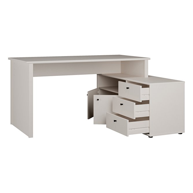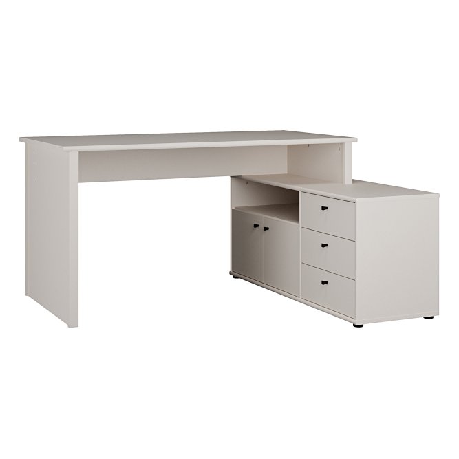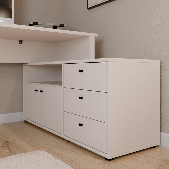 Biurko narożne z komodą w stylowym piaskowym kolorze o idealny wybór, jeżeli chcesz umeblować pokój młodzieżowy lub domowe biuro. Posiada użyteczny blat, który gwarantuje wysoki komfort pracy i nauki. Trzy szuflady i półka zapewniają odpowiednią ilość miejsca do przechowywania i ułatwiają zachowanie porządku na roboczym blacie. Aby stworzyć spójną aranżację, zestaw biurko z innymi meblami z tej samej kolekcji.