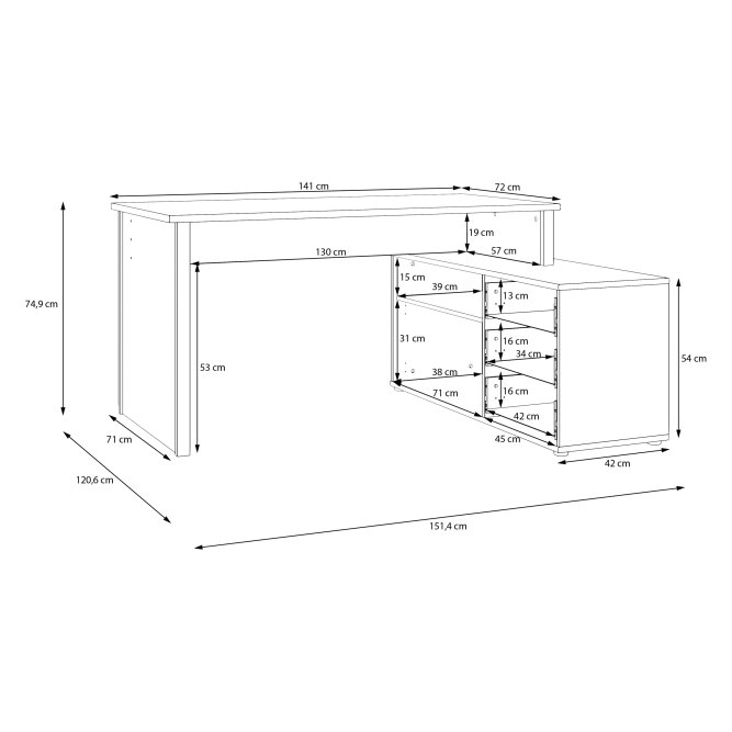 - Funkcjonalne biurko o wymiarach: szerokość 120,6 cm x wysokość 74,9 cm x głębokość 151,4 cm