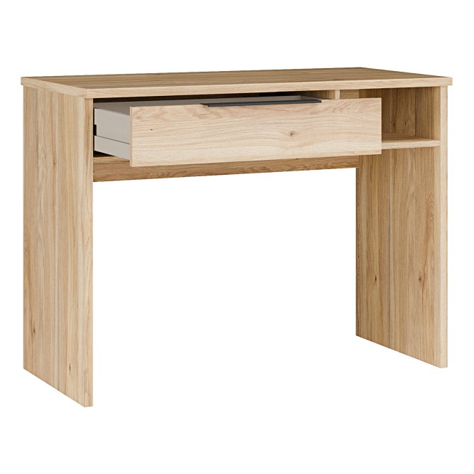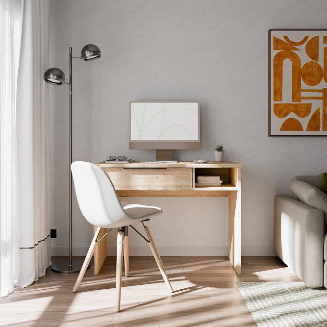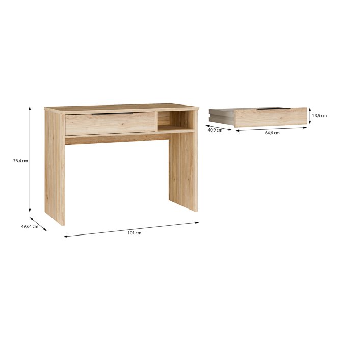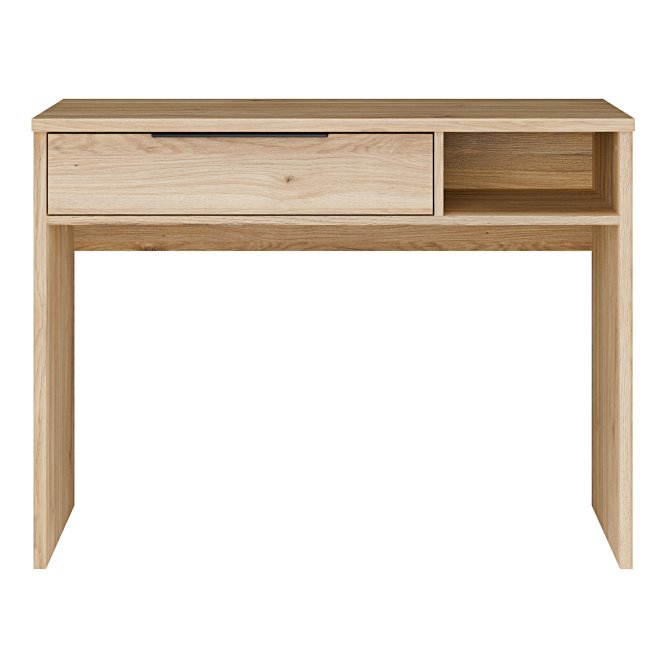 Niewielkie biurko z kolekcji ORKNEY będzie idealnym rozwiązaniem dla mniejszych mieszkań. 1 szuflada pomoże zorganizować najpotrzebniejsze rzeczy, aby były zawsze pod ręką. Wymiary blatu 101x50 cm sprawiają, że to biurko może również pełnić funkcję toaletki. Kupując ten produkt, zyskujesz multifunkcyjny mebel.