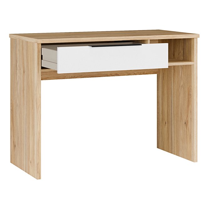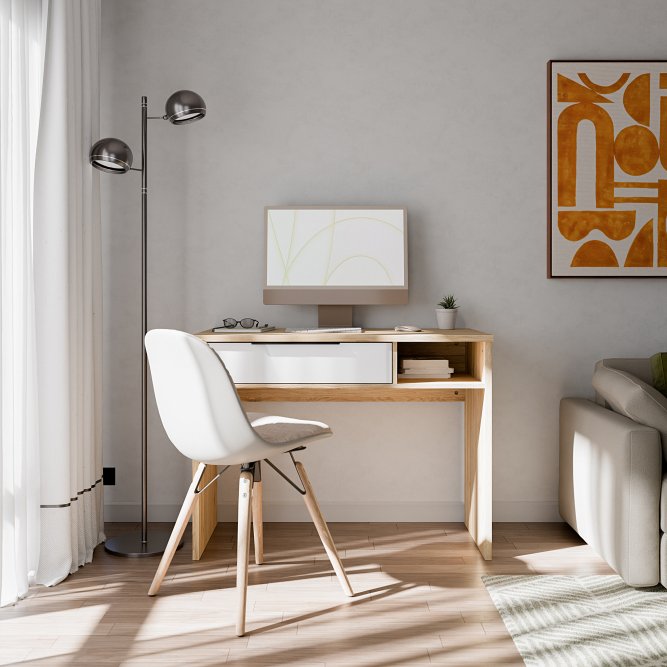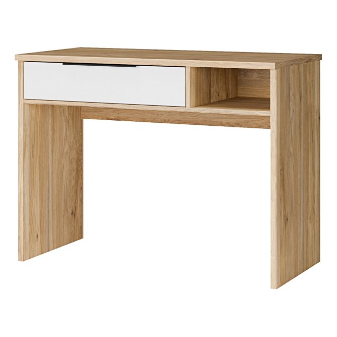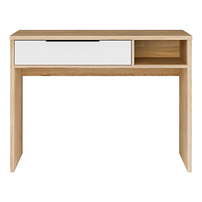 Niewielkie biurko z kolekcji ORKNEY będzie idealnym rozwiązaniem dla mniejszych mieszkań. 1 szuflada pomoże zorganizować najpotrzebniejsze rzeczy, aby były zawsze pod ręką. Wymiary blatu 101x50 cm sprawiają, że to biurko może również pełnić funkcję toaletki. Kupując ten produkt, zyskujesz multifunkcyjny mebel.