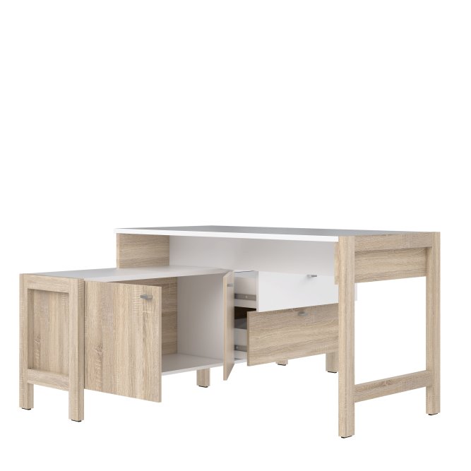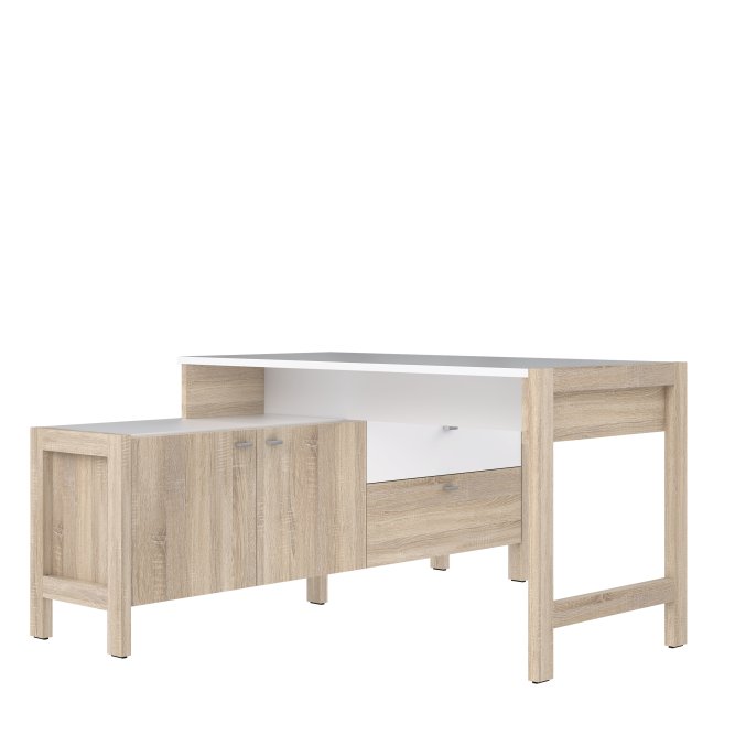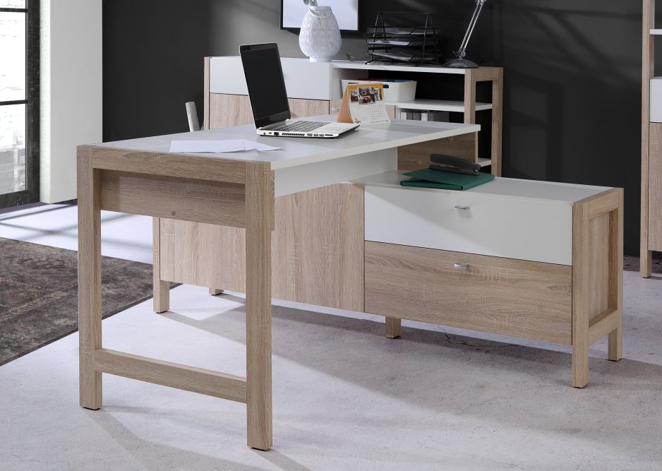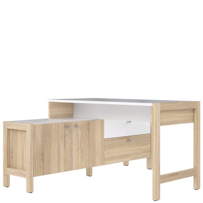 - Subtelne zestawienie dekoru Dąb Sonoma imitującego naturalne drewno z białymi wstawkami odświeży wnętrze i pozwoli na dopasowanie biurka do każdej aranżacji wnętrz