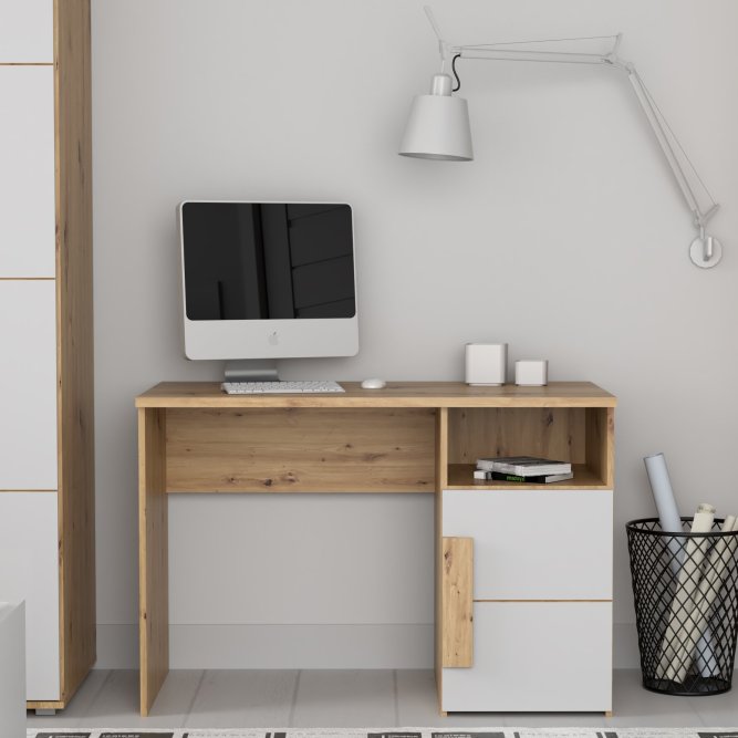 Biurko w modnych kolorach – w dekorze Dąb Artisan o naturalnym odcieniu połączony z czystą Bielą - doskonale pasuje do młodzieżowego pokoju. Taka kolorystyka z pewnością spodoba się nastolatkom. Dodatkowo front szafki dzieli ozdobne frezowanie z wykończeniem w kolorze uchwytu.