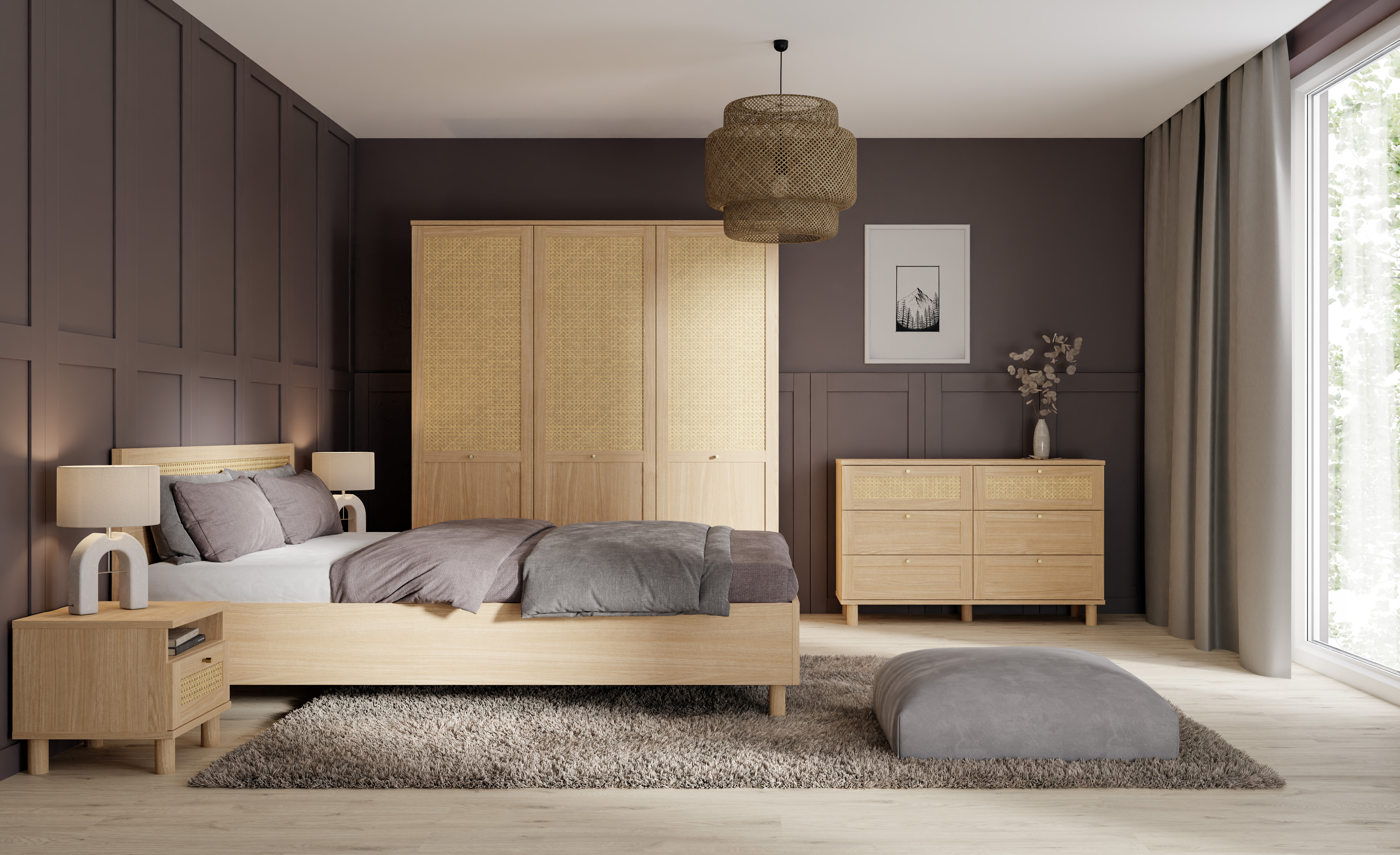 Z myślą o przytulnych sypialniach w stylu eko i boho powstała kolekcja CALOROSO. Meble do sypialni wyróżniają się frontami z plecionki wiedeńskiej, która podkreśla wyjątkowy charakter mebli. Na uwagę zasługują minimalistyczne uchwyty oraz wysokie nóżki, dodające lekkości bryłom. W linii znajdziesz wszystko to, czego nie może zabraknąć w sypialni: szafę, łóżko, szafkę nocną, i komodę. Postaw na kolekcję CALOROSO i stwórz wymarzoną strefę relaksu.