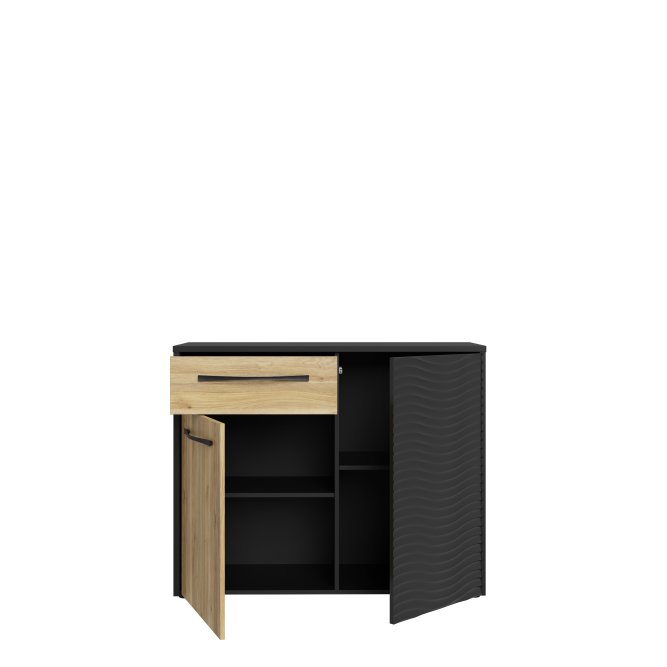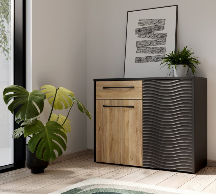 - Komoda w efektowym połączeniu dekorów Czarny / Dąb Mauvella / Terra
