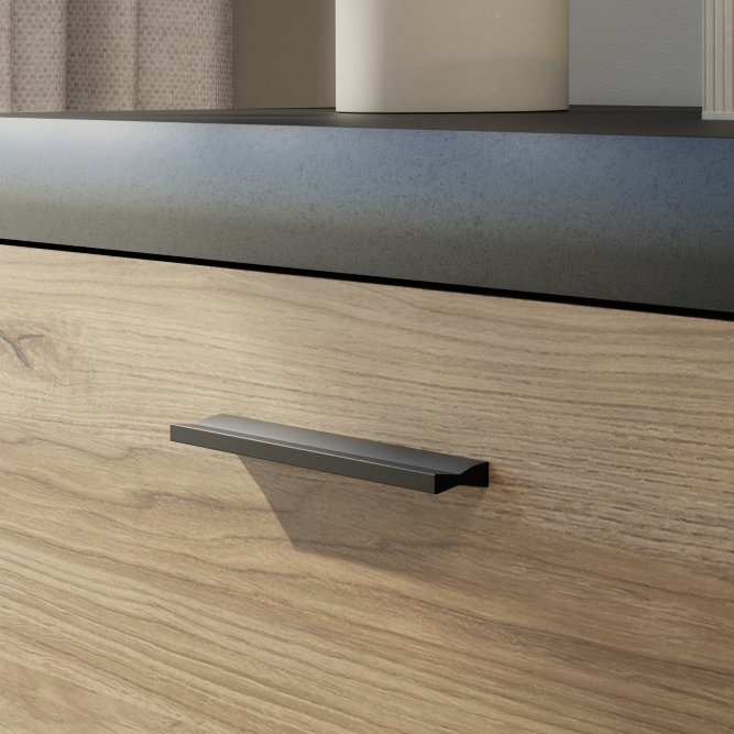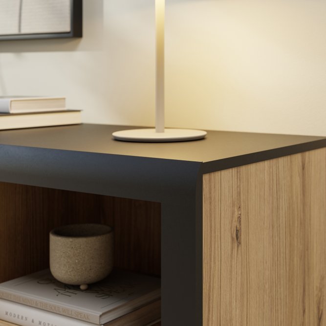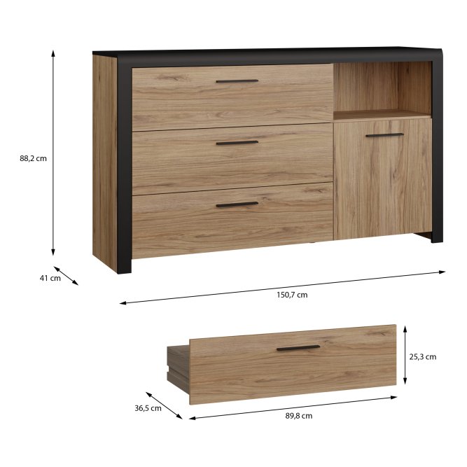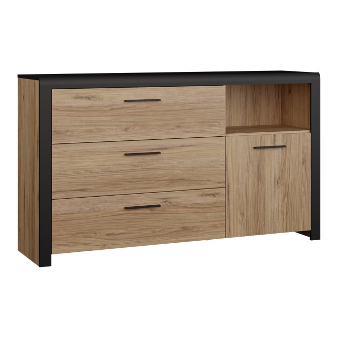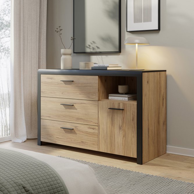 - Komoda w efektowym połączeniu dekorów Dąb Catania/Czarny mat/Czarny
