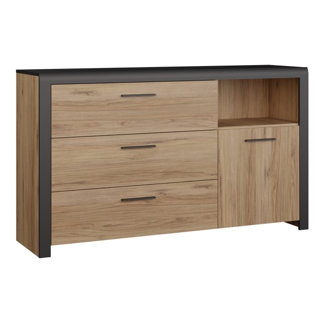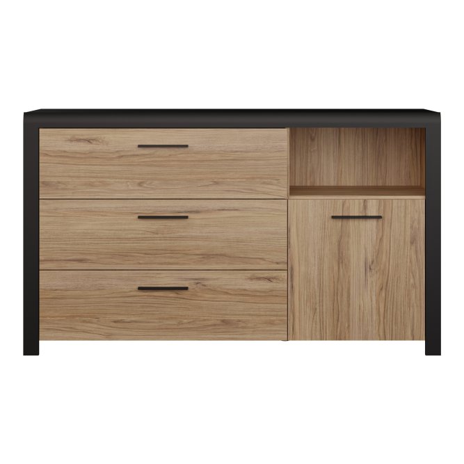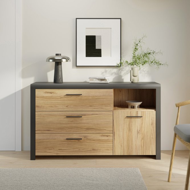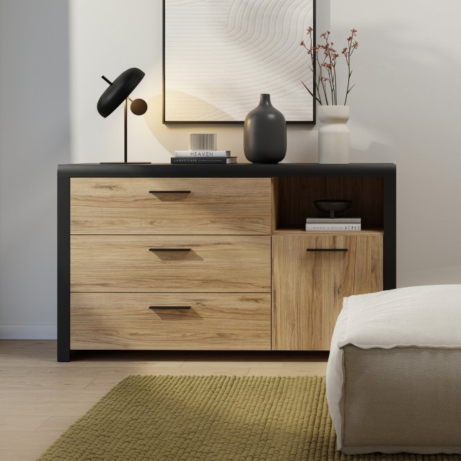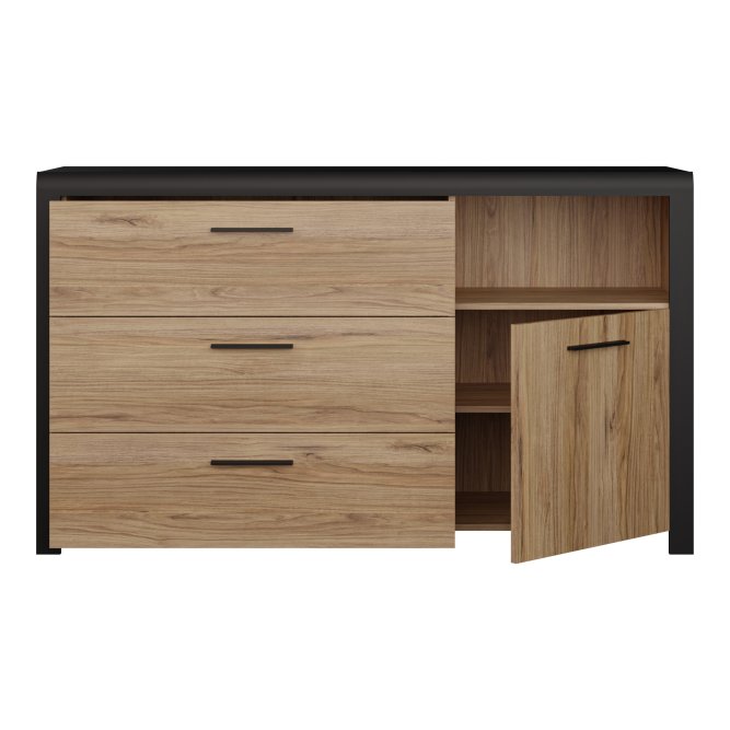 Komoda z kolekcji DALATE dopełni każde mieszkanie urządzone w stylu loftowym. Mebel posiada 3 szuflady, zamykaną szafkę oraz otwartą wnękę, dzięki czemu zmieścisz wszystkie niezbędne przedmioty. Na blacie komody wyeksponujesz zdjęcia, kwiaty i pamiątki rodzinne, a całą aranżację wnętrza możesz dodatkowo uzupełnić o pozostałe elementy kolekcji DALATE.