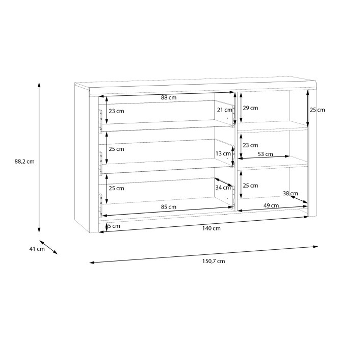 - Mebel o wymiarach: szerokość 150.7 cm x wysokość 88.2 cm x głębokość 41 cm, z różnymi opcjami przechowywania