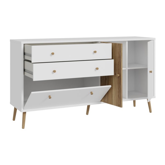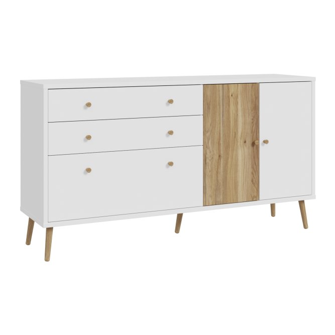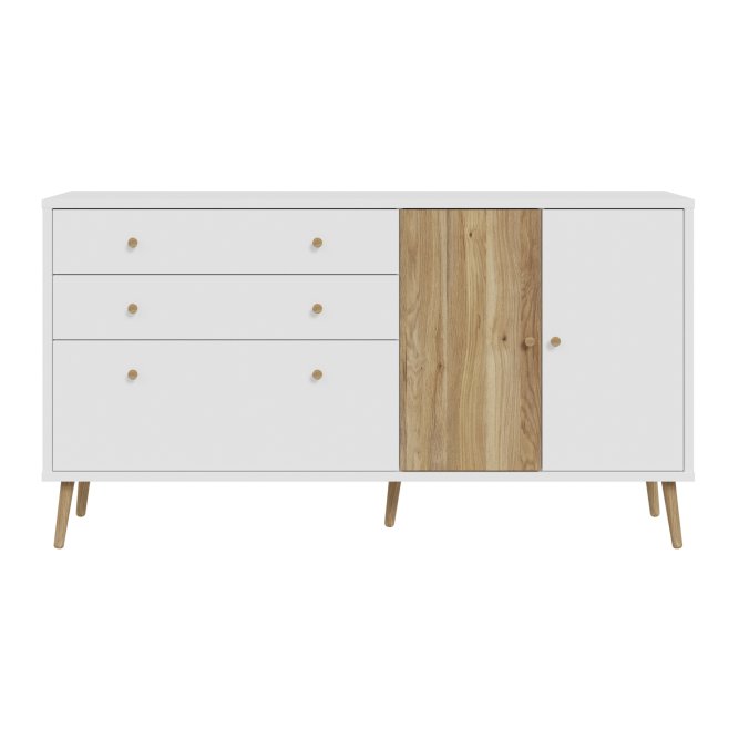 Kilka ważnych cech wyróżnia komodę HARLLSON spośród wielu innych mebli. Po pierwsze: sposób montażu. Składanie mebli jeszcze nigdy nie było tak szybkie i proste!  Montaż może trwać nawet do 10 razy krócej niż w przypadku tradycyjnej metody składania, a dodatkowo nie wymaga używania prawie żadnych narzędzi, bo większość elementów łączy się ze sobą na “click”. Umożliwia to Easy Klix, innowacyjny system oparty na technologii Threespine ID®, który pozwala również na wielokrotny demontaż mebla i jego ponowne złożenie. W razie przeprowadzki nie musisz się martwić, że po rozłożeniu komoda się zniszczy. Przekonaj się jak prosty i przyjemny może być teraz montaż i demontaż mebla! Druga ważna cecha komody, a także całej kolekcji HARLLSON Easy Klix by FORTE, to design - współczesny, ale jednocześnie przywołujący to, co najlepsze w stylu minionych epok. Subtelne w formie i kolorystyce meble łączą w sobie piękno i funkcjonalność. Wszystkie modele osadzono na drewnianych, wysokich, lekko skośnych nóżkach, dzięki temu nawet 3-drzwiowa szafa jest wizualnie lekka i nie przytłoczy pomieszczenia. Delikatne drewniane uchwyty w formie gałek podkreślają styl kolekcji i są idealnie dopasowane do poszczególnych opcji kolorystycznych. Meble będą wspaniałą bazą do aranżacji wygodnego pokoju dziennego oraz sypialni w duchu skandynawskim, scandi boho czy retro. Komoda HARLLSON, w efektownym połączeniu dekorów białego i Dąb Mauvella, z powodzeniem sprawdzi się w wielu pomieszczeniach Twojego domu i mieszkania. Zapewnia odpowiednio dużo miejsca do przechowywania, a także na wyeksponowanie ulubionych dekoracji lub zdjęć. Wyposażona jest w 2 szuflady na drobiazgi oraz 3 szafki, w których schowasz większe przedmioty. Dzięki systemowi cichego domyku, drzwiczki zamykają oraz otwierają się delikatnie i bezgłośnie.