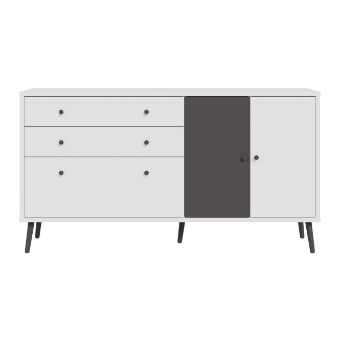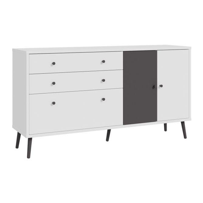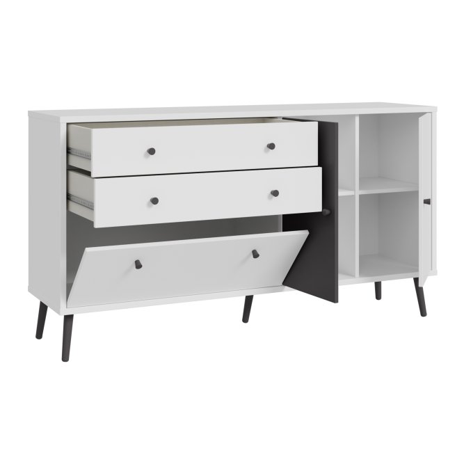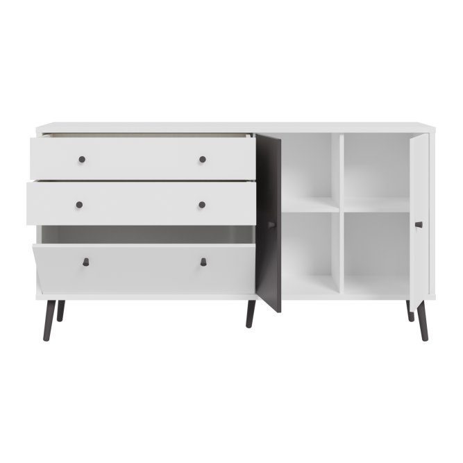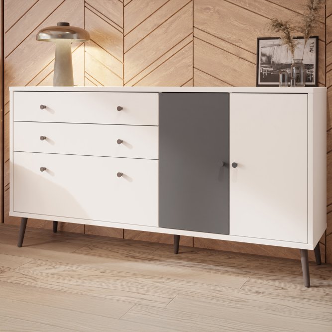 Kilka ważnych cech wyróżnia komodę HARLLSON spośród wielu innych mebli. Po pierwsze: sposób montażu. Składanie mebli jeszcze nigdy nie było tak szybkie i proste! Montaż może trwać nawet do 10 razy krócej niż w przypadku tradycyjnej metody składania, a dodatkowo nie wymaga używania prawie żadnych narzędzi, bo większość elementów łączy się ze sobą na “click”. Umożliwia to Easy Klix, innowacyjny system oparty na technologii Threespine ID®, który pozwala również na wielokrotny demontaż mebla i jego ponowne złożenie. W razie przeprowadzki nie musisz się martwić, że po rozłożeniu komoda się zniszczy. Przekonaj się jak prosty i przyjemny może być teraz montaż i demontaż mebla! Druga ważna cecha komody, a także całej kolekcji HARLLSON Easy Klix by FORTE, to design - współczesny, ale jednocześnie przywołujący to, co najlepsze w stylu minionych epok. Subtelne w formie i kolorystyce meble łączą w sobie piękno i funkcjonalność. Wszystkie modele osadzono na drewnianych, wysokich, lekko skośnych nóżkach, dzięki temu nawet 3-drzwiowa szafa jest wizualnie lekka i nie przytłoczy pomieszczenia. Delikatne drewniane uchwyty w formie gałek podkreślają styl kolekcji i są idealnie dopasowane do poszczególnych opcji kolorystycznych. Meble będą wspaniałą bazą do aranżacji wygodnego pokoju dziennego oraz sypialni w duchu skandynawskim, scandi boho czy retro. Komoda HARLLSON, w efektownym połączeniu dekorów białego i Dąb Mauvella, z powodzeniem sprawdzi się w wielu pomieszczeniach Twojego domu i mieszkania. Zapewnia odpowiednio dużo miejsca do przechowywania, a także na wyeksponowanie ulubionych dekoracji lub zdjęć. Wyposażona jest w 2 szuflady na drobiazgi oraz 3 szafki, w których schowasz większe przedmioty. Dzięki systemowi cichego domyku, drzwiczki zamykają oraz otwierają się delikatnie i bezgłośnie.