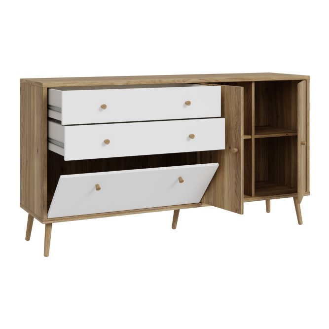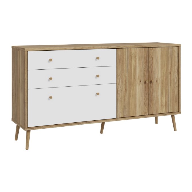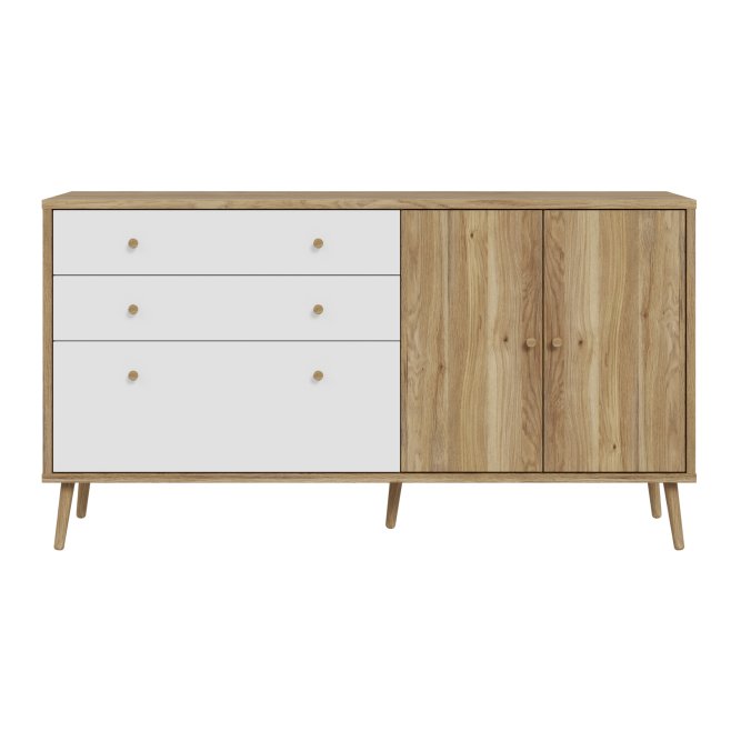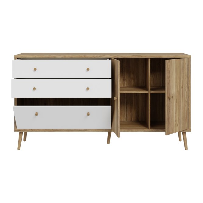 Kilka ważnych cech wyróżnia komodę HARLLSON spośród wielu innych mebli. Po pierwsze: sposób montażu. Składanie mebli jeszcze nigdy nie było tak szybkie i proste! Montaż może trwać nawet do 10 razy krócej niż w przypadku tradycyjnej metody składania, a dodatkowo nie wymaga używania prawie żadnych narzędzi, bo większość elementów łączy się ze sobą na “click”. Umożliwia to Easy Klix, innowacyjny system oparty na technologii Threespine ID®, który pozwala również na wielokrotny demontaż mebla i jego ponowne złożenie. W razie przeprowadzki nie musisz się martwić, że po rozłożeniu komoda się zniszczy. Przekonaj się jak prosty i przyjemny może być teraz montaż i demontaż mebla! Druga ważna cecha komody, a także całej kolekcji HARLLSON Easy Klix by FORTE, to design - współczesny, ale jednocześnie przywołujący to, co najlepsze w stylu minionych epok. Subtelne w formie i kolorystyce meble łączą w sobie piękno i funkcjonalność. Wszystkie modele osadzono na drewnianych, wysokich, lekko skośnych nóżkach, dzięki temu nawet 3-drzwiowa szafa jest wizualnie lekka i nie przytłoczy pomieszczenia. Delikatne drewniane uchwyty w formie gałek podkreślają styl kolekcji i są idealnie dopasowane do poszczególnych opcji kolorystycznych. Meble będą wspaniałą bazą do aranżacji wygodnego pokoju dziennego oraz sypialni w duchu skandynawskim, scandi boho czy retro. Komoda HARLLSON, w efektownym połączeniu dekorów białego i Dąb Mauvella, z powodzeniem sprawdzi się w wielu pomieszczeniach Twojego domu i mieszkania. Zapewnia odpowiednio dużo miejsca do przechowywania, a także na wyeksponowanie ulubionych dekoracji lub zdjęć. Wyposażona jest w 2 szuflady na drobiazgi oraz 3 szafki, w których schowasz większe przedmioty. Dzięki systemowi cichego domyku, drzwiczki zamykają oraz otwierają się delikatnie i bezgłośnie.
