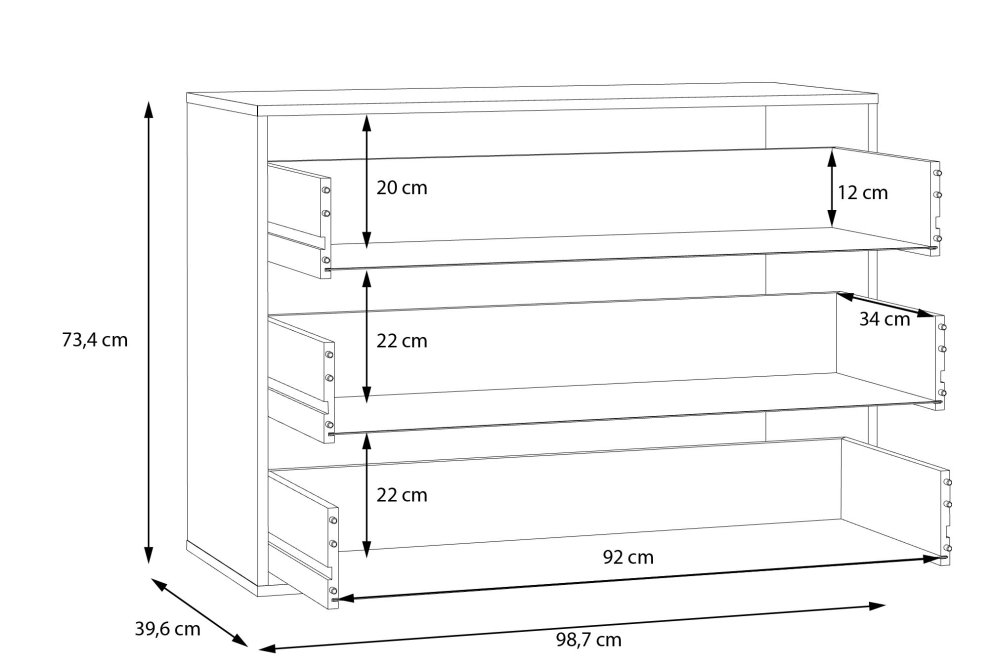 - Mebel o wymiarach: szerokość 98,7 cm, wysokość 70,6 cm i głębokość 39,6 cm