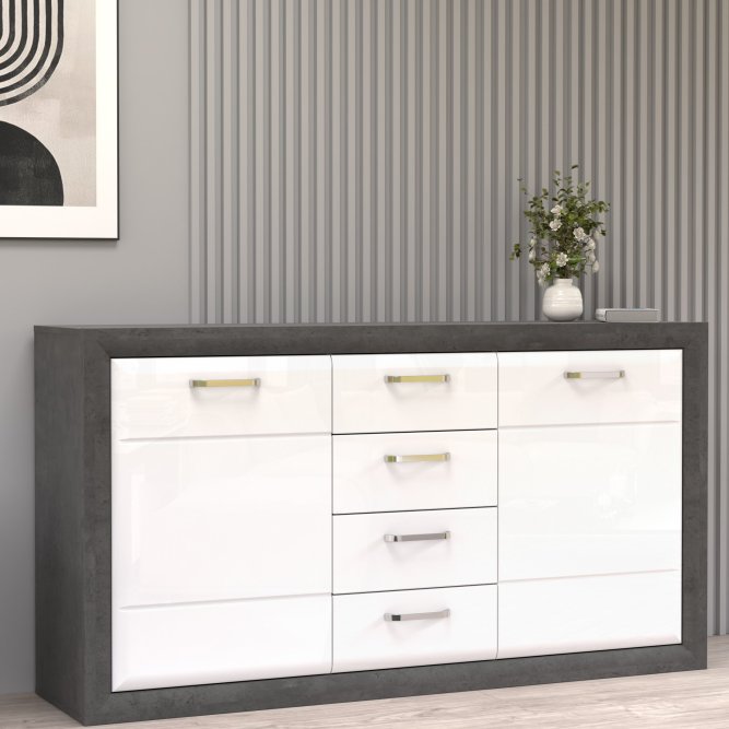 Ta pojemna komoda wykonana została w połączeniu dwóch dekorów Betonu Ciemnoszarego i Białego Połysku. Zastosowanie nowatorskiego dekoru nawiązującego do betonu dało nowe możliwości aranżacji salonu. Mebel idealnie sprawdzi się w pokoju dziennym lub jadalni.