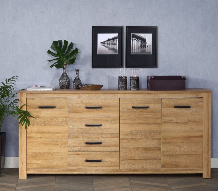 Nowoczesna komoda jest elementem całości pokoju dziennego, salonu oraz jadalni. Posiada cztery szuflady oraz trzy zamknięte szafki, dzięki czemu zapewni dużo miejsca do przechowywania różnego rodzaju przedmiotów a bardzo szeroki blat doskonale sprawdzi się jako miejsce do wyeksponowania ulubionych dekoracji czy rodzinnych zdjęć, pamiątek.