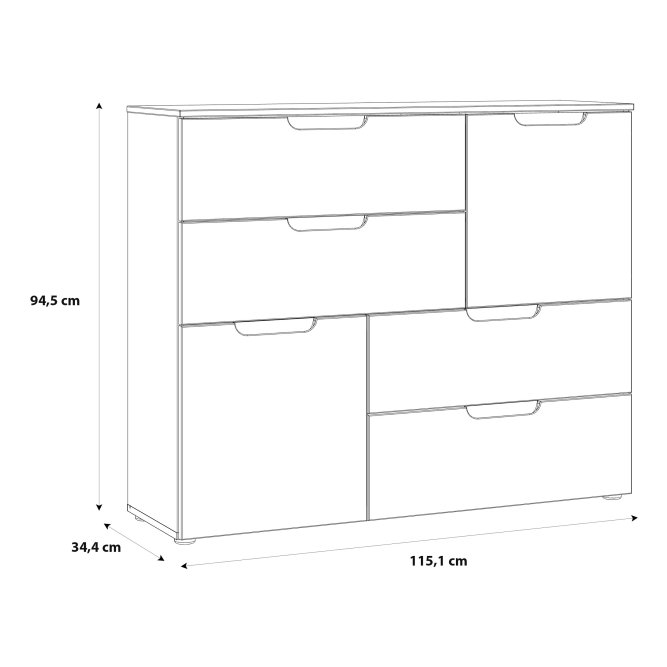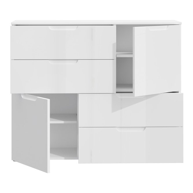 Praktyczna i elegancka komoda w stylu nowoczesnym wykonana w Białym dekorze. Posiada odpowiednio dużo miejsca do przechowywania. Doskonale sprawdzi się w sypialni, salonie czy pokoju dziennym.