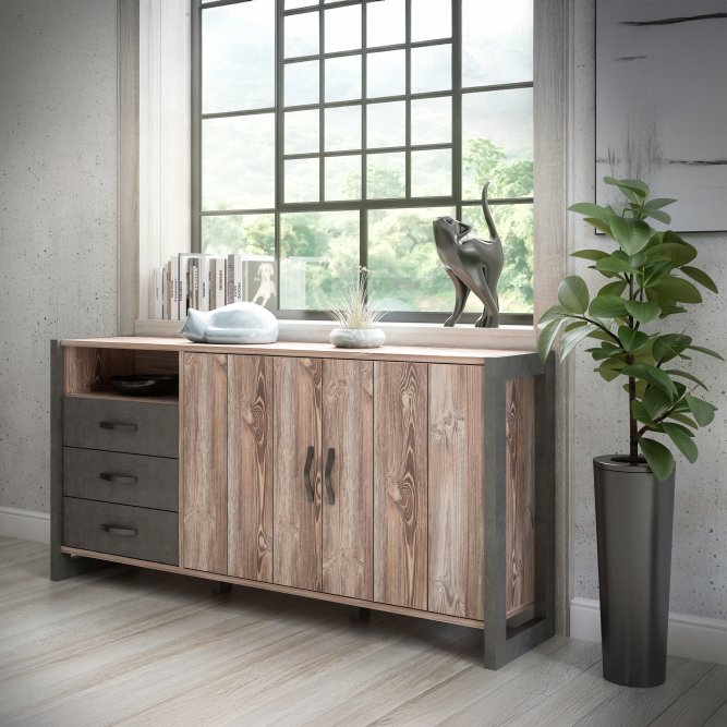 - Mebel posiada cztery półki ukryte za frontami w dekorze Sosny, jedną otwartą półkę i trzy szuflady kryjące się za frontami w dekorze Ciemnoszarego Betonu