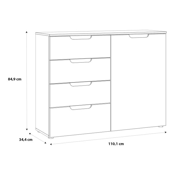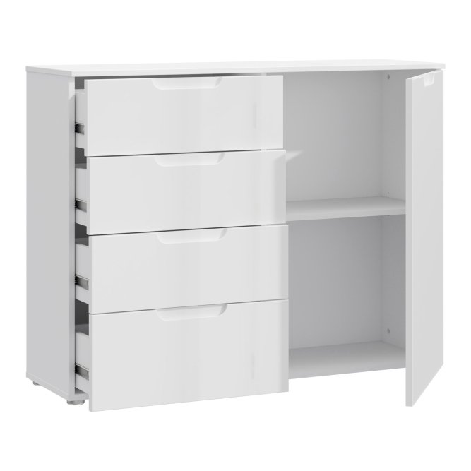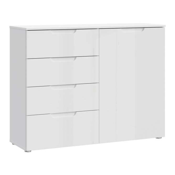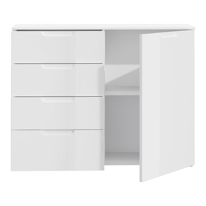 Praktyczna i elegancka komoda w stylu nowoczesnym wykonana w Białym dekorze. Posiada odpowiednio dużo miejsca do przechowywania. Doskonale sprawdzi się w sypialni, salonie czy pokoju dziennym.