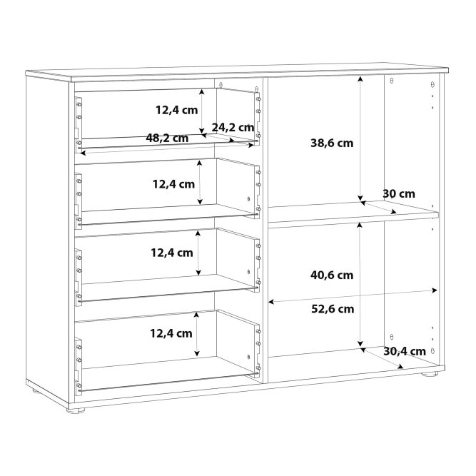 - Posiada jedną półkę z płyty i cztery szuflady
