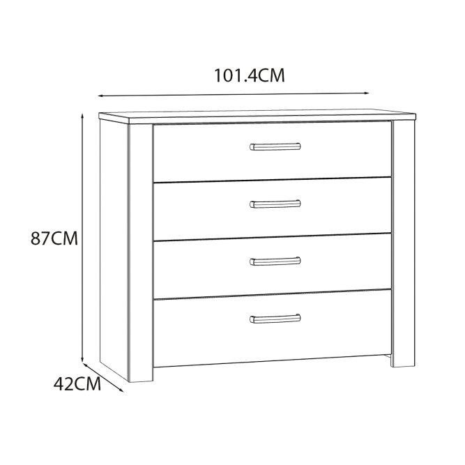 Komoda podkreśli unikatowy charakter wnętrza, a jednocześnie zapewni odpowiednią przestrzeń do przechowywania. 4 szuflady pomogą Ci pomieścić mnóstwo przedmiotów, jak bielizna, drobna garderoba, dokumenty i różnego rodzaju akcesoria. Blat będzie doskonałym miejscem na wyeksponowanie zdjęć, ozdobnych świeczników, ceramiki, pamiątek z wakacji oraz innych ulubionych dekoracji. Komoda z innymi meblami kolekcji stworzą spójną aranżację wnętrza takiego jak sypialnia czy salon.