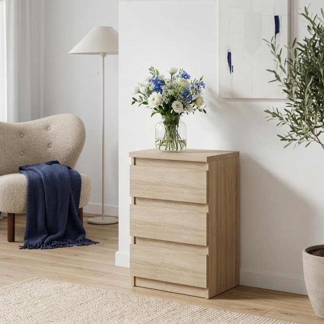 Płytka komoda z 3 szufladami w dębowym kolorze to praktyczny i stylowy mebel, który doskonale sprawdzi się w mniejszych pomieszczeniach, takich jak przedpokój, sypialnia, czy biuro. Dzięki swoim kompaktowym wymiarom zmieści się nawet w wąskich przestrzeniach, jednocześnie oferując funkcjonalne miejsce do przechowywania. Trzy pojemne szuflady umożliwiają wygodne przechowywanie różnych przedmiotów, od odzieży i akcesoriów po dokumenty. Subtelne uchwyty w postaci frezów na frontach i minimalistyczny design sprawiają, że komoda wpisuje się w skandynawskie oraz nowoczesne aranżacje, dodając wnętrzu elegancji i lekkości.