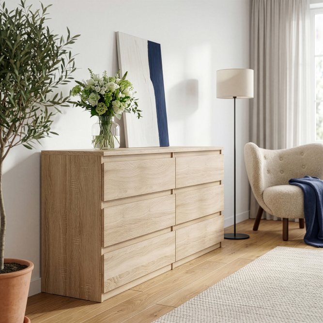 Duża komoda z 6 szufladami w dębowym kolorze to elegancki i praktyczny mebel, idealny do przechowywania rzeczy w sypialni, salonie, domowym biurze, pokoju młodzieżowym, przedpokoju,a nawet w garderobie. Jej minimalistyczny design i uchwyty w formie subtelnych frezów na frontach nadają jej nowoczesny wygląd, który wpasuje się w niemal każdą aranżację wnętrza - polecamy tę komodę zwłaszcza do pomieszczeń urządzonych w stylu skandynawskim. Pojemne szuflady zapewniają mnóstwo miejsca na ubrania, akcesoria czy dokumenty, pomagając w zachowaniu porządku. Dębowa kolorystyka dodaje wnętrzu przytulnego charakteru, a brak tradycyjnych uchwytów sprawia, że komoda wygląda lekko i stylowo. To idealne połączenie funkcjonalności i estetyki dla miłośników minimalizmu oraz elegancji.