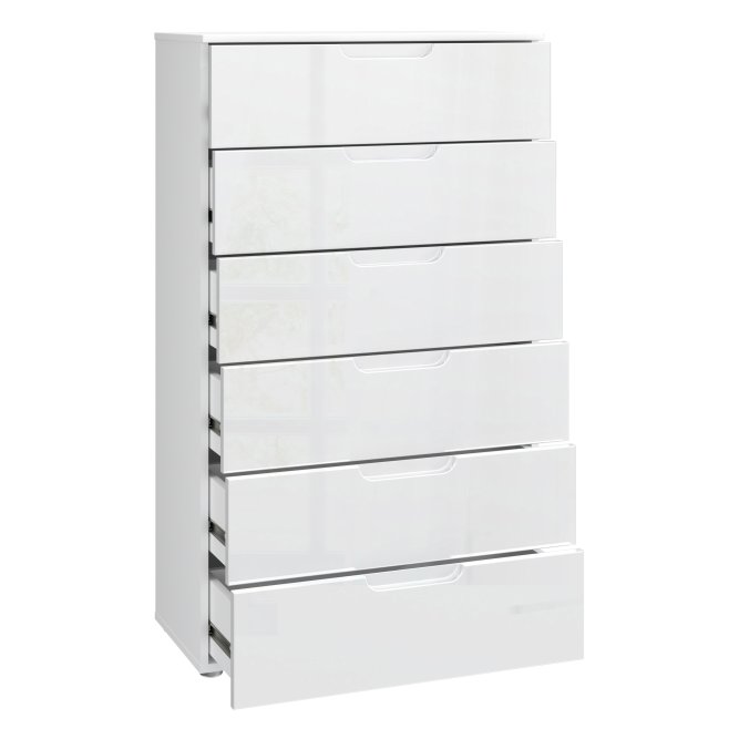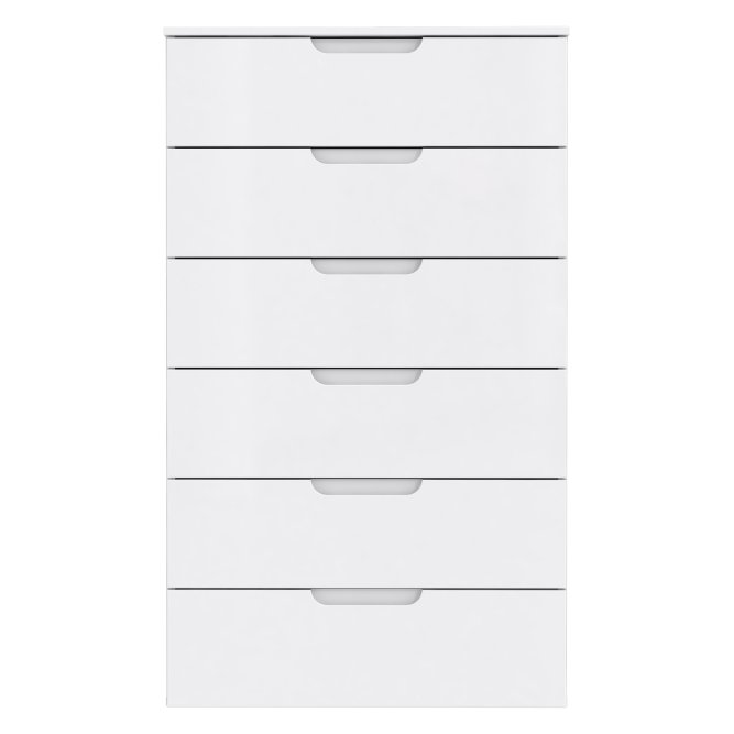 Praktyczna i elegancka, wysoka komoda w stylu nowoczesnym wykonana w Białym dekorze. Posiada odpowiednio dużo miejsca do przechowywania. Doskonale sprawdzi się w sypialni, salonie czy pokoju dziennym.