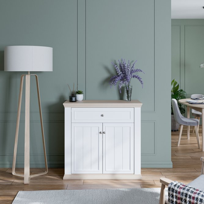 - Komoda w efektowym połączeniu dekorów Biały / Dąb Riva i Biały