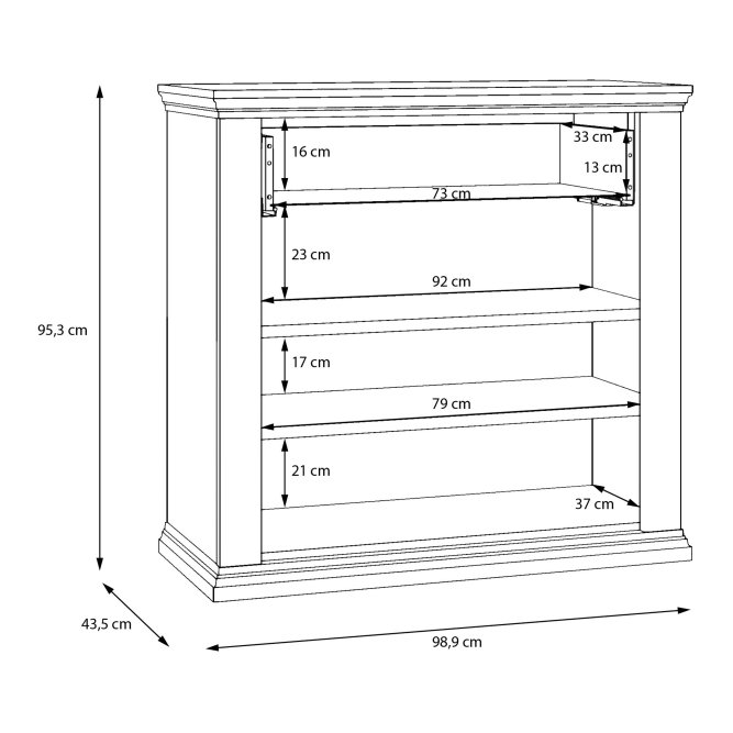 - Mebel o wymiarach: szerokość 98.9 cm x wysokość 95.3 cm x głębokość 43.5 cm, z różnymi opcjami przechowywania