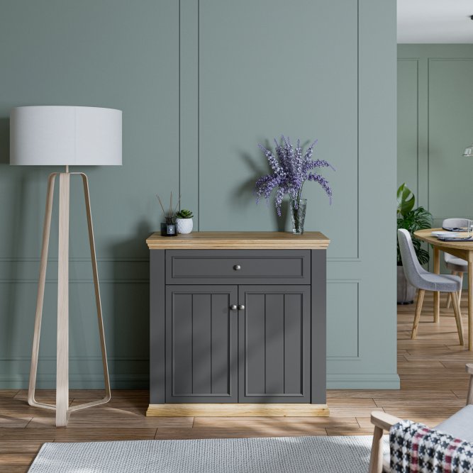 - Komoda w efektowym połączeniu dekorów Dąb Mauvella / Uni Wolfram szary i Uni Wolfram szary