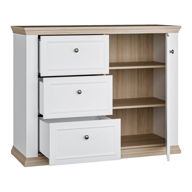 - Komoda w efektowym połączeniu dekorów Biały / Dąb Riva i Biały