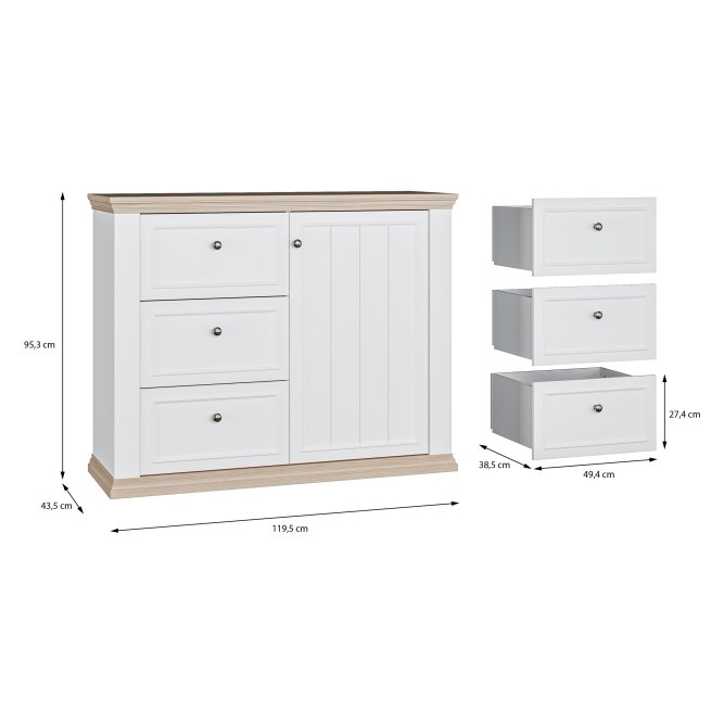 - Mebel o wymiarach: szerokość 119.5 cm x wysokość 95.3 cm x głębokość 43.5 cm, z różnymi opcjami przechowywania