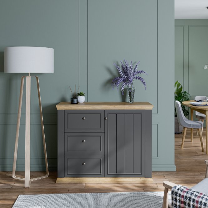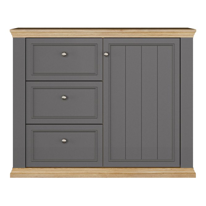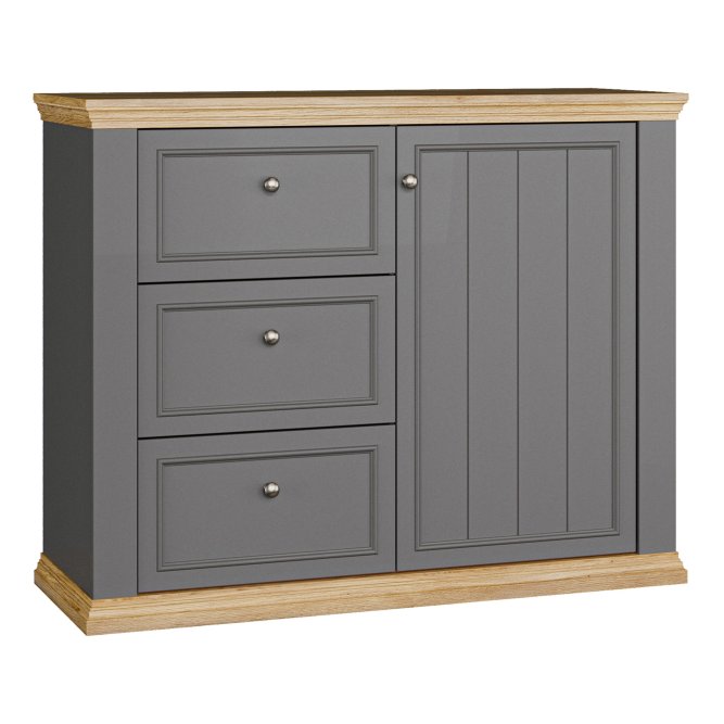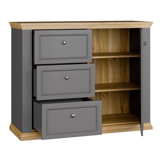 - Komoda w efektowym połączeniu dekorów Dąb Mauvella / Uni Wolfram szary i Uni Wolfram szary