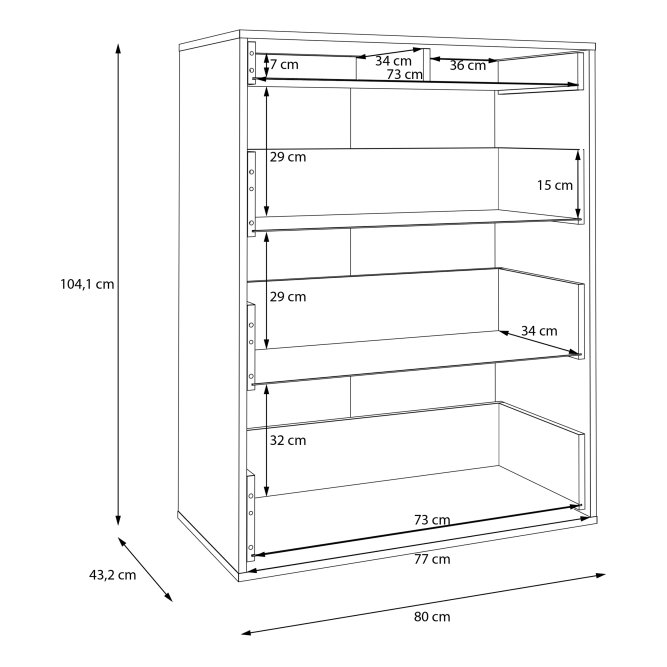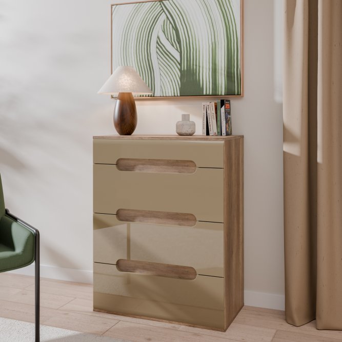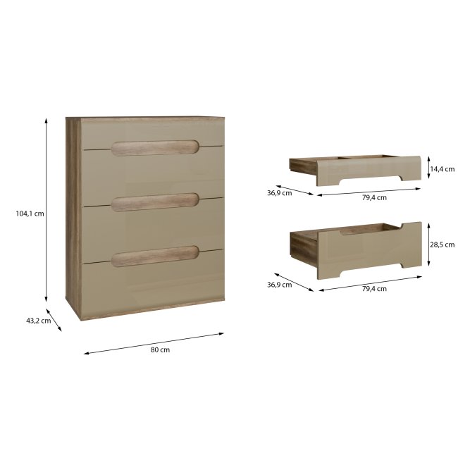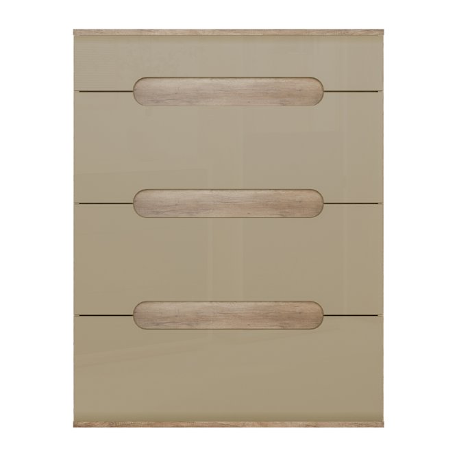 Wysoka, nowoczesna komoda z kolekcji TIZIANO wykonana została w połączeniu Dębu Antycznego (korpus) z Beżowym Połyskiem (fronty). Mebel posiada cztery szuflady. Segmentowy układ frontów tworzą dekoracyjne frezowania, będące jednocześnie uchwytami mebla. Komoda będzie świetnie proezentować się w salonie, jadalni lub sypialni.