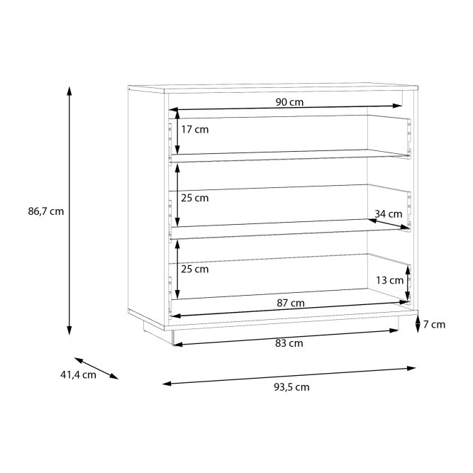 - Mebel o wymiarach: szerokość 93.5 cm x wysokość 86.7 cm x głębokość 41.4 cm, z różnymi opcjami przechowywania