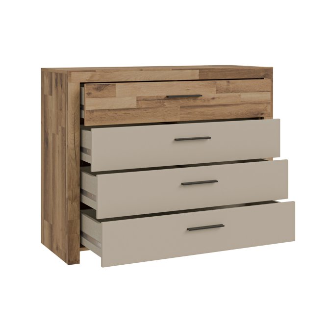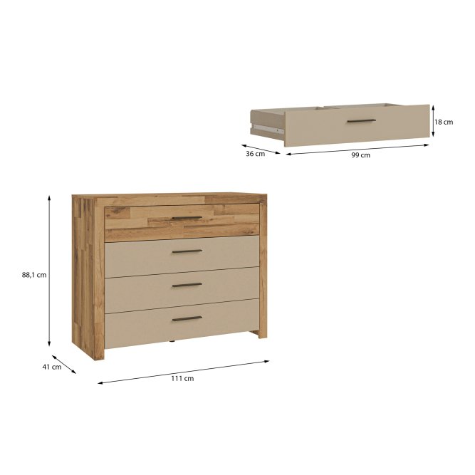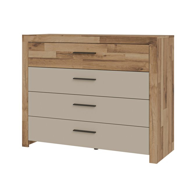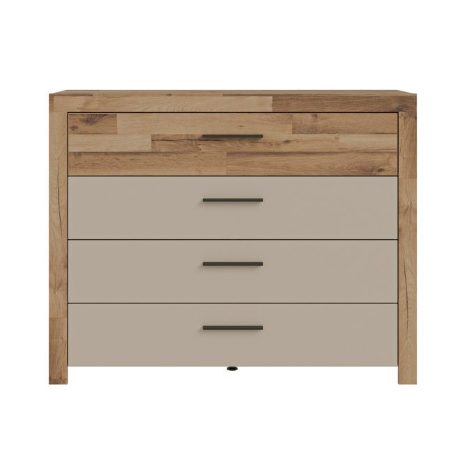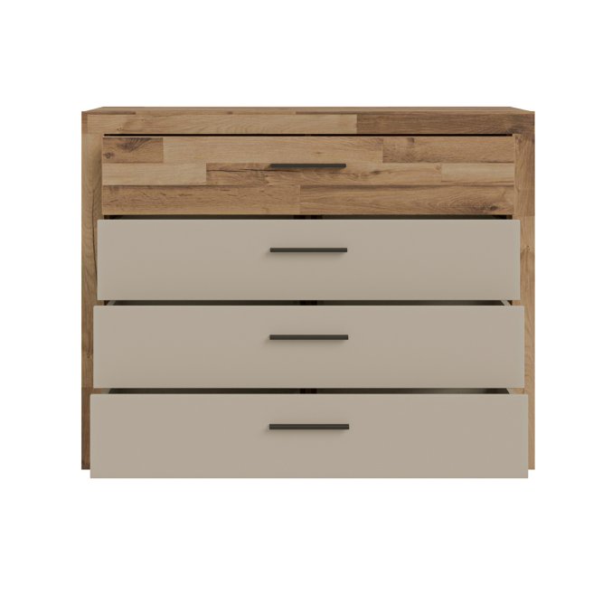 - Komoda w efektowym połączeniu dekorów Dąb klepkowy i Piaskowy / Dąb klepkowy