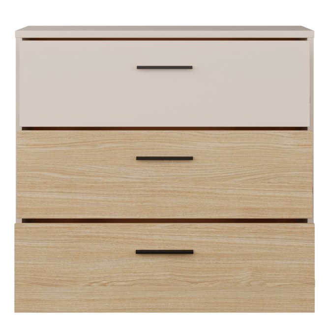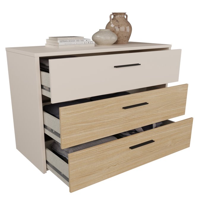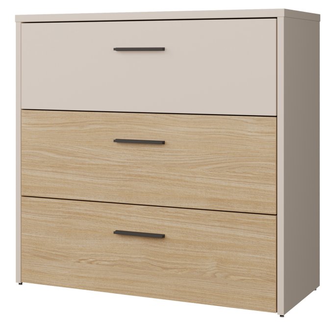 - Komoda w efektowym połączeniu dekorów Piaskowy i Piaskowy / Dąb Elegancja