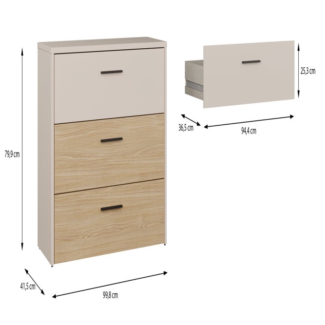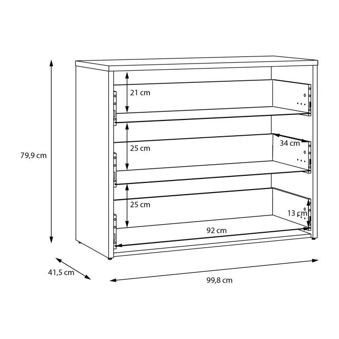- Mebel o wymiarach: szerokość 99.8 cm x wysokość 79.9 cm x głębokość 41.5 cm, z różnymi opcjami przechowywania