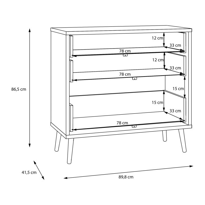 - Mebel o wymiarach: szerokość 89.8 cm x wysokość 86.5 cm x głębokość 41.5 cm, z różnymi opcjami przechowywania