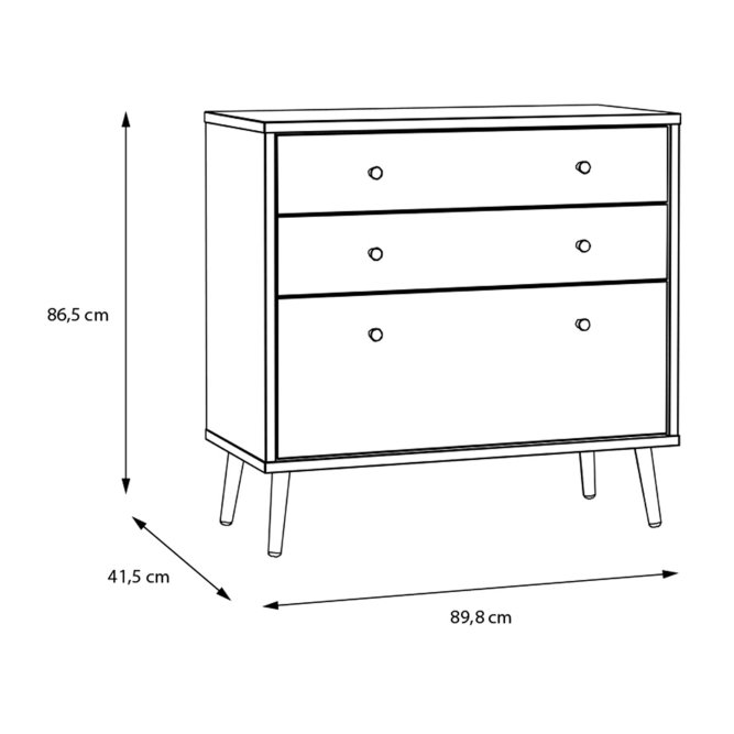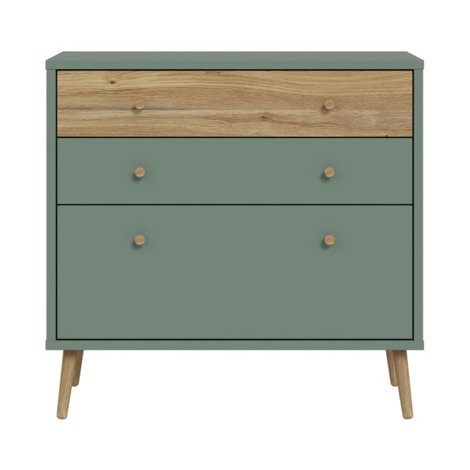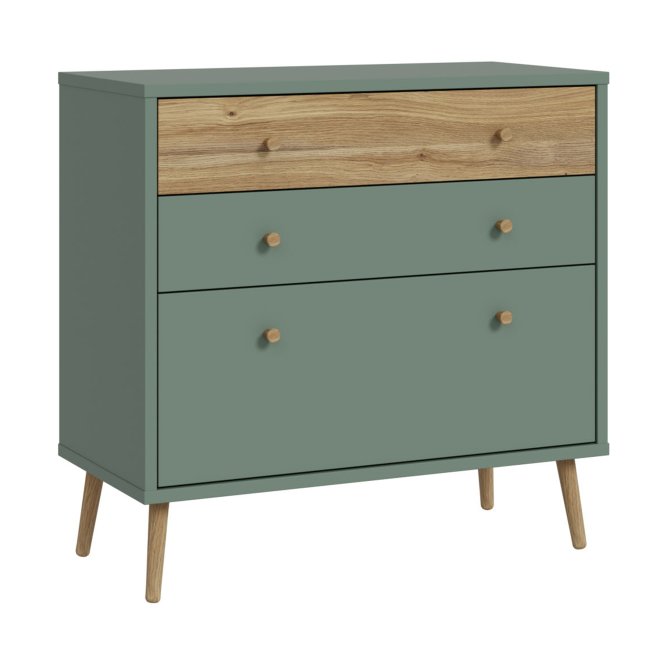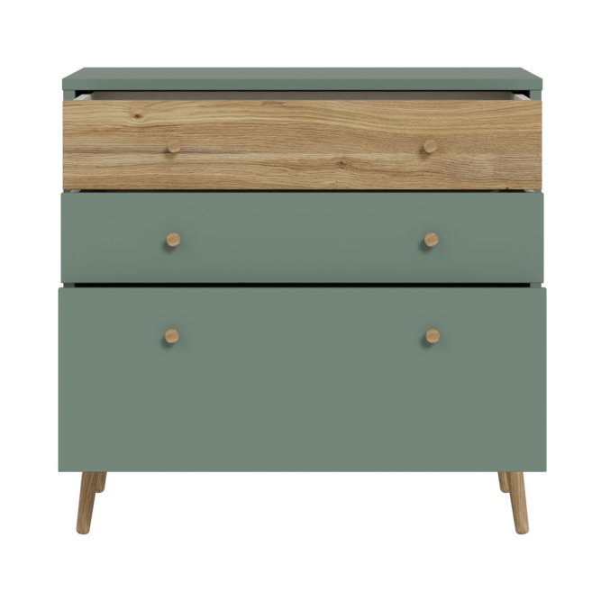Kilka ważnych cech wyróżnia komodę HARLLSON spośród wielu innych mebli. Po pierwsze: sposób montażu. Składanie mebli jeszcze nigdy nie było tak szybkie i proste! Montaż może trwać nawet do 10 razy krócej niż w przypadku tradycyjnej metody składania, a dodatkowo nie wymaga używania prawie żadnych narzędzi, bo większość elementów łączy się ze sobą na “click”. Umożliwia to Easy Klix, innowacyjny system oparty na technologii Threespine ID®, który pozwala również na wielokrotny demontaż mebla i jego ponowne złożenie. W razie przeprowadzki nie musisz się martwić, że po rozłożeniu komoda się zniszczy. Przekonaj się jak prosty i przyjemny może być teraz montaż i demontaż mebla! Druga ważna cecha komody, a także całej kolekcji HARLLSON Easy Klix by FORTE, to design - współczesny, ale jednocześnie przywołujący to, co najlepsze w stylu minionych epok. Subtelne w formie i kolorystyce meble łączą w sobie piękno i funkcjonalność. Wszystkie modele osadzono na drewnianych, wysokich, lekko skośnych nóżkach, dzięki temu nawet 3-drzwiowa szafa jest wizualnie lekka i nie przytłoczy pomieszczenia. Delikatne drewniane uchwyty w formie gałek podkreślają styl kolekcji i są idealnie dopasowane do poszczególnych opcji kolorystycznych. Meble będą wspaniałą bazą do aranżacji wygodnego pokoju dziennego oraz sypialni w duchu skandynawskim, scandi boho czy retro. Komoda HARLLSON, w efektownym połączeniu dekorów szałwiowego i Dąb Mauvella, z powodzeniem sprawdzi się w wielu pomieszczeniach Twojego domu i mieszkania. Zapewnia odpowiednio dużo miejsca do przechowywania, a także na wyeksponowanie ulubionych dekoracji lub zdjęć. Wyposażona jest w 2 mniejsze szuflady na drobiazgi oraz 1 większą szufladę, w której schowasz większe przedmioty. Wszystkie szuflady osadzone zostały na prowadnicach z pełnym wysuwem, dzięki czemu korzystanie z mebla jest wyjątkowo komfortowe.