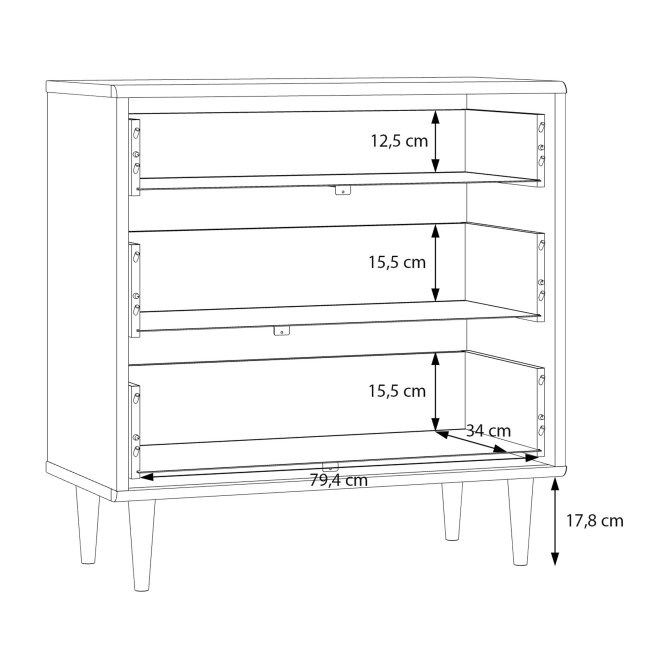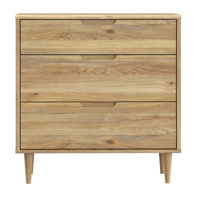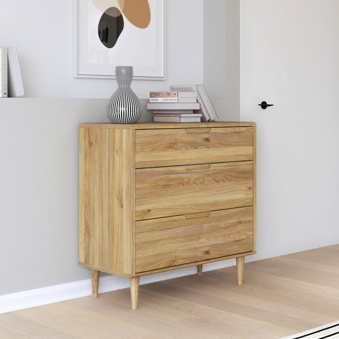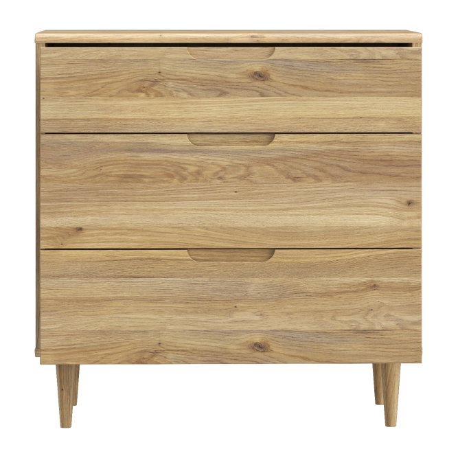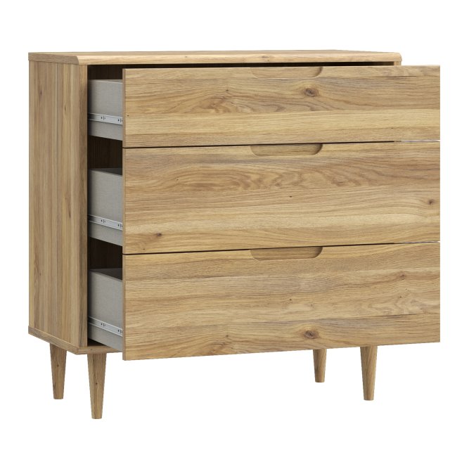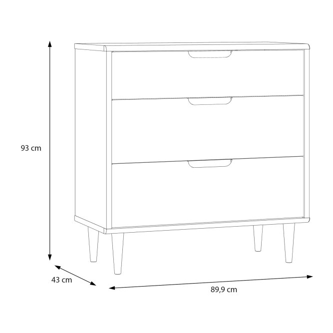 Składanie mebli jeszcze nigdy nie było tak proste i przyjemne! Komodę z kolekcji SHERBROOK złożysz do 10 raz szybciej niż model z tradycyjnymi okuciami, a dodatkowo nie będziesz potrzebować prawie żadnych narzędzi, ponieważ większość elementów łączy się ze sobą „na click”. Taką możliwość daje Easy Klix, innowacyjny system oparty na technologii Threespine ID®, który gwarantuje nie tylko wygodny montaż, lecz także demontaż. W razie przeprowadzki nie musisz się martwić, że po rozłożeniu komoda się zniszczy. Kolekcja SHERBROOKE jest przykładem na to, że design minionych dekad może inspirować i zachwycać! Meble stoją na wysokich, zwężających się ku dołowi nóżkach, które znajdziemy w kultowych modelach z lat 50. i 60. Również kolorystyka i prosta linia mebli, bez zdobień i ornamentów nawiązują do popularnych projektów z początków drugiej połowy XX wieku. Dla osób, które lubią otaczać się dobrym designem, a przy tym cenią prostotę i funkcjonalność, kolekcja SHERBROOKE będzie doskonałym wyborem. Komoda SHERBROOK to bardzo praktyczny i przydatny mebel w każdym pomieszczeniu. Doskonale zda egzamin z przechowywania w salonie, sypialni, jadali i przedpokoju. W trzech szufladach schowasz drobne i większe przedmioty, od bielizny, po dokumenty, płyty, po komplet sztućców. Dzięki prowadnicom z pełnym wysuwem, korzystanie z szuflad jest wyjątkowo komfortowe. Komoda jest wykonana w ciepłym dekorze Dąb Mauvella, który pozwala poczuć bliskość natury i stworzyć przytulny klimat w domu. Wysokie drewniane nóżki dodają wnętrzu lekkości, a także ułatwiają utrzymanie porządku pod meblem.