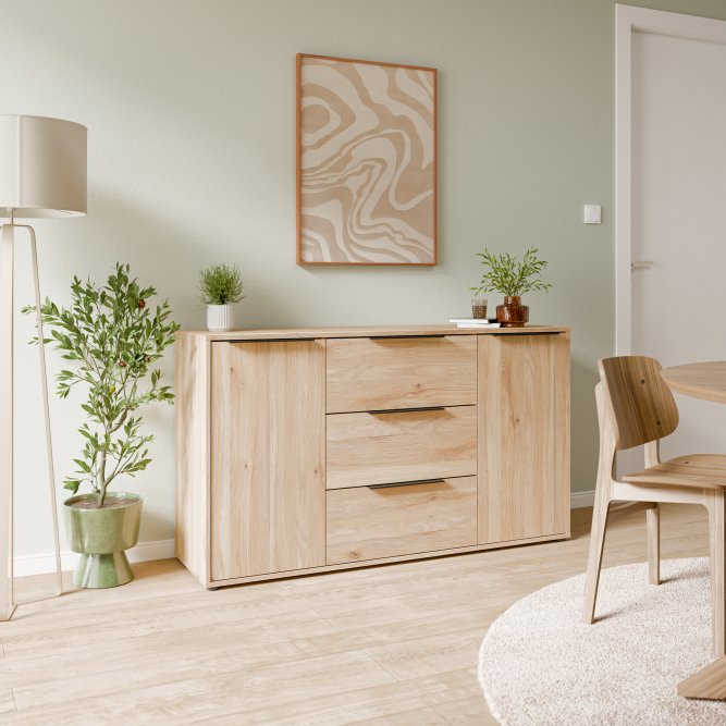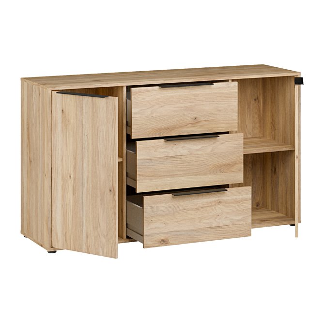 Komoda z kolekcji ORKNEY dopełni każde mieszkanie urządzone w stylu skandynawskim lub loftowym. Mebel posiada 3 szuflady i 2 zamykane szafki, dzięki czemu zmieścisz wszystkie niezbędne przedmioty. Na blacie komody wyeksponujesz zdjęcia, kwiaty i pamiątki rodzinne, a całą aranżację wnętrza możesz dodatkowo uzupełnić o pozostałe elementy kolekcji ORKNEY.