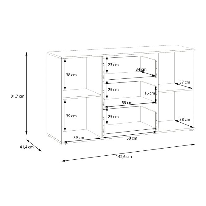 - Mebel o wymiarach: szerokość 142.6 cm x wysokość 81.7 cm x głębokość 41.4 cm, z różnymi opcjami przechowywania