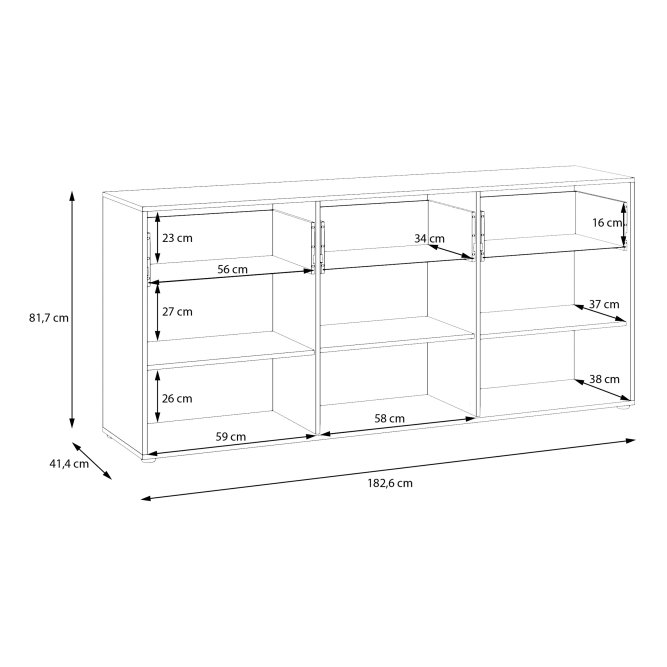 - Mebel o wymiarach: szerokość 182.6 cm x wysokość 81.7 cm x głębokość 41.4 cm, z różnymi opcjami przechowywania