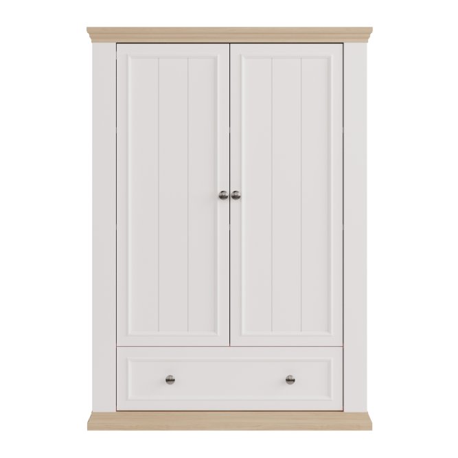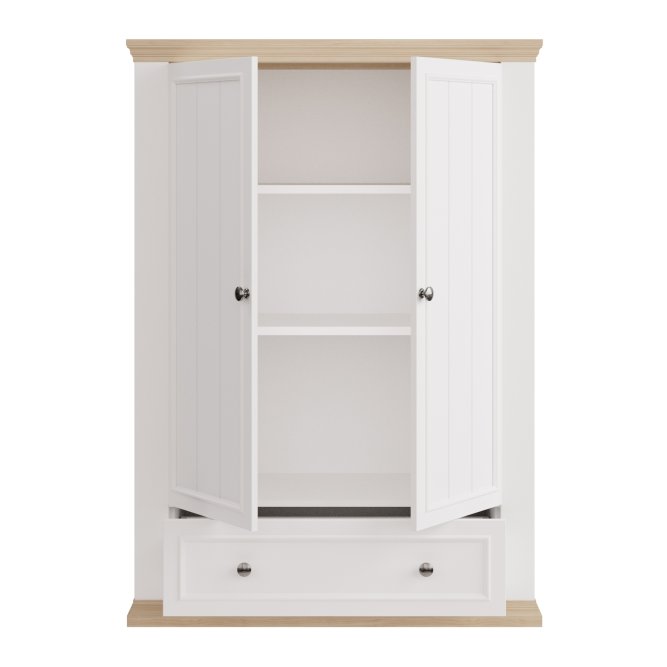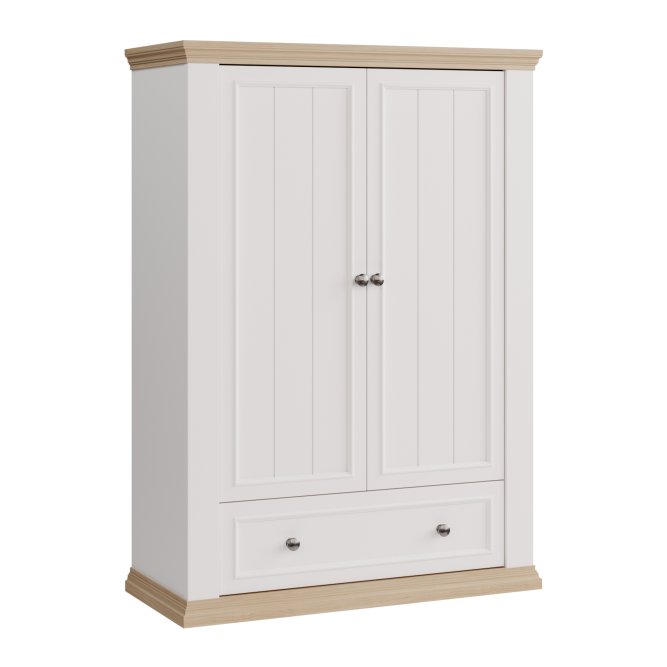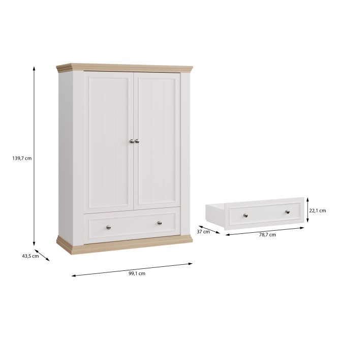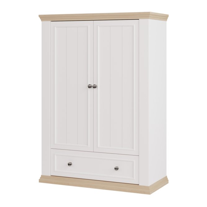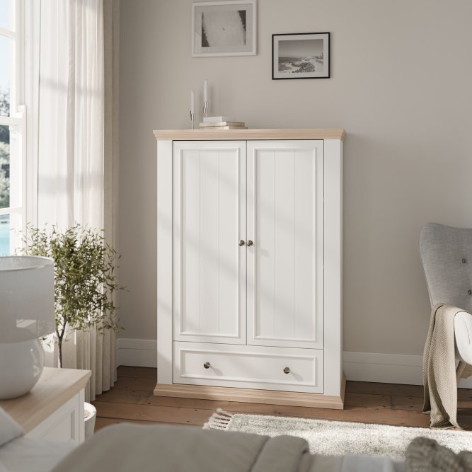 Wysoka komoda z kolekcji PONTYPOOL dopełni każdą sypialnię urządzoną w stylu prowansalskim lub rustykalnym. Mebel posiada szeroką szufladę oraz dużą zamykaną szafkę, dzięki czemu komoda może pełnić w sypialni funkcję bieliźniarki. Aby stworzyć spójną aranżację wnętrza, możesz dodatkowo dokupić pozostałe elementy kolekcji PONTYPOOL.