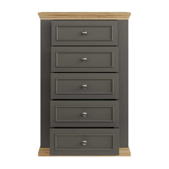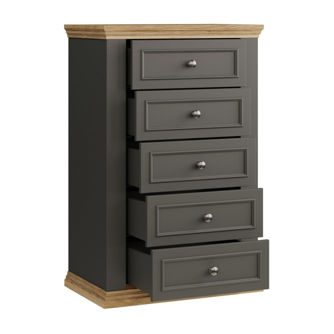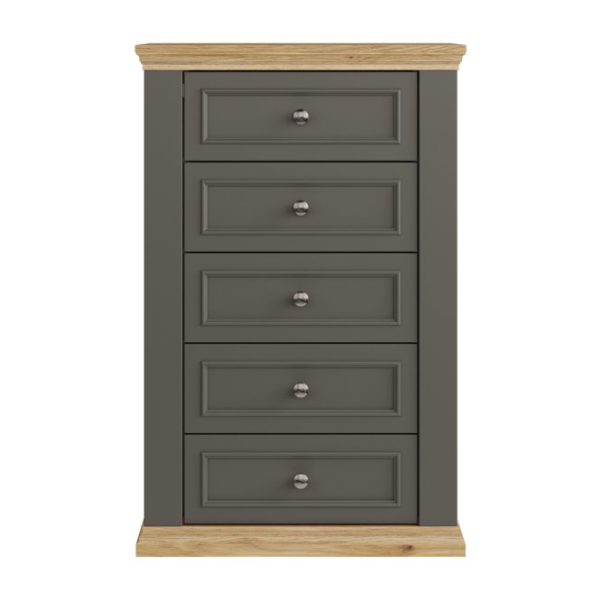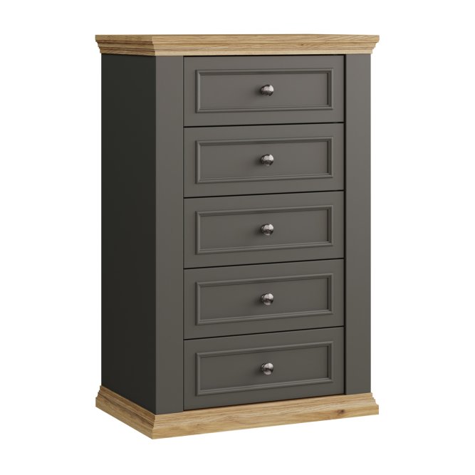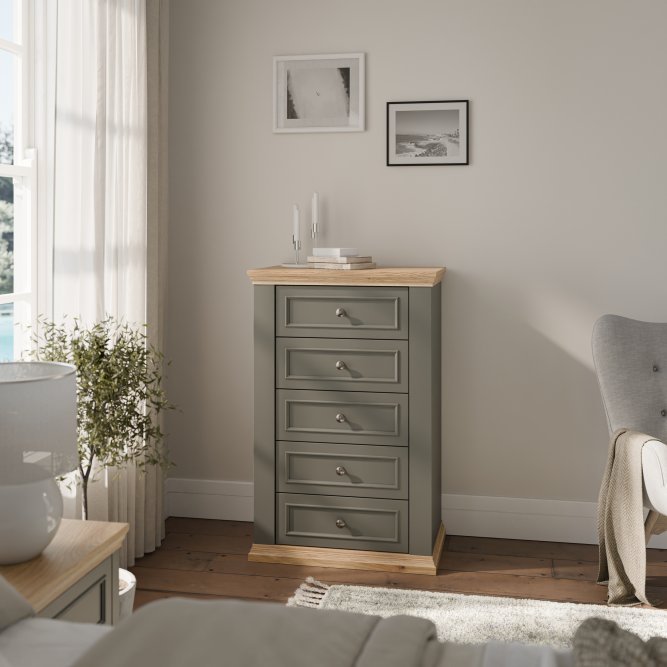 Wąska komoda o szerokości 70 cm z kolekcji PONTYPOOL dopełni każde mieszkanie urządzone w stylu prowansalskim lub rustyka;nym. Mebel posiada 5 szuflad, dzięki czemu zmieścisz wszystkie niezbędne przedmioty. Na blacie komody wyeksponujesz zdjęcia, kwiaty i pamiątki rodzinne, a całą aranżację wnętrza możesz dodatkowo uzupełnić o pozostałe elementy kolekcji PONTYPOOL.