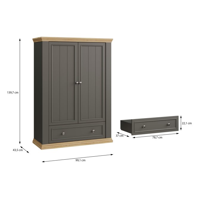 - Mebel o wymiarach: szerokość 98.9 cm x wysokość 140.2 cm x głębokość 43.5 cm, z różnymi opcjami przechowywania