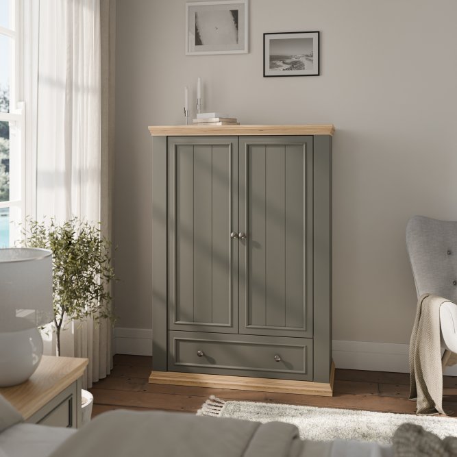 Wysoka komoda z kolekcji PONTYPOOL dopełni każdą sypialnię urządzoną w stylu prowansalskim lub rustykalnym. Mebel posiada szeroką szufladę oraz dużą zamykaną szafkę, dzięki czemu komoda może pełnić w sypialni funkcję bieliźniarki. Aby stworzyć spójną aranżację wnętrza, możesz dodatkowo dokupić pozostałe elementy kolekcji PONTYPOOL.